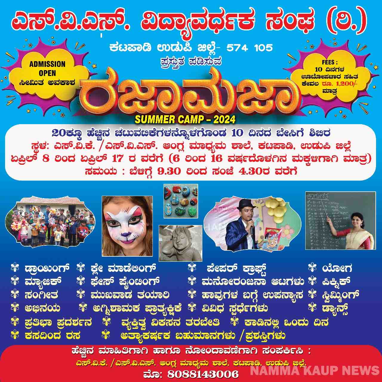 ಕಟಪಾಡಿ : ಎಸ್ ವಿ ಎಸ್ ವಿದ್ಯಾವರ್ಧಕ ಸಂಘ (ರಿ.) ಕಟಪಾಡಿ ಇವರು ಪ್ರಸ್ತುತ ಪಡಿಸುವ ರಜಾ ಮಜಾ -2024 ಮಕ್ಕಳ ಬೇಸಿಗೆ ಶಿಬಿರವು ಏಪ್ರಿಲ್ 8 ರಿಂದ ಏಪ್ರಿಲ್ 17 ರ ವರೆಗೆ 10 ದಿನಗಳ ಕಾಲ ಎಸ್ ವಿ ಎಸ್ ಆಂಗ್ಲ ಮಾದ್ಯಮ ಶಾಲಾ ವಠಾರದಲ್ಲಿ ಜರಗಲಿದೆ. 6 ರಿಂದ 16 ವರ್ಷದ ಮಕ್ಕಳು ಭಾಗವಹಿಸಲು ಅವಕಾಶವಿದೆ.