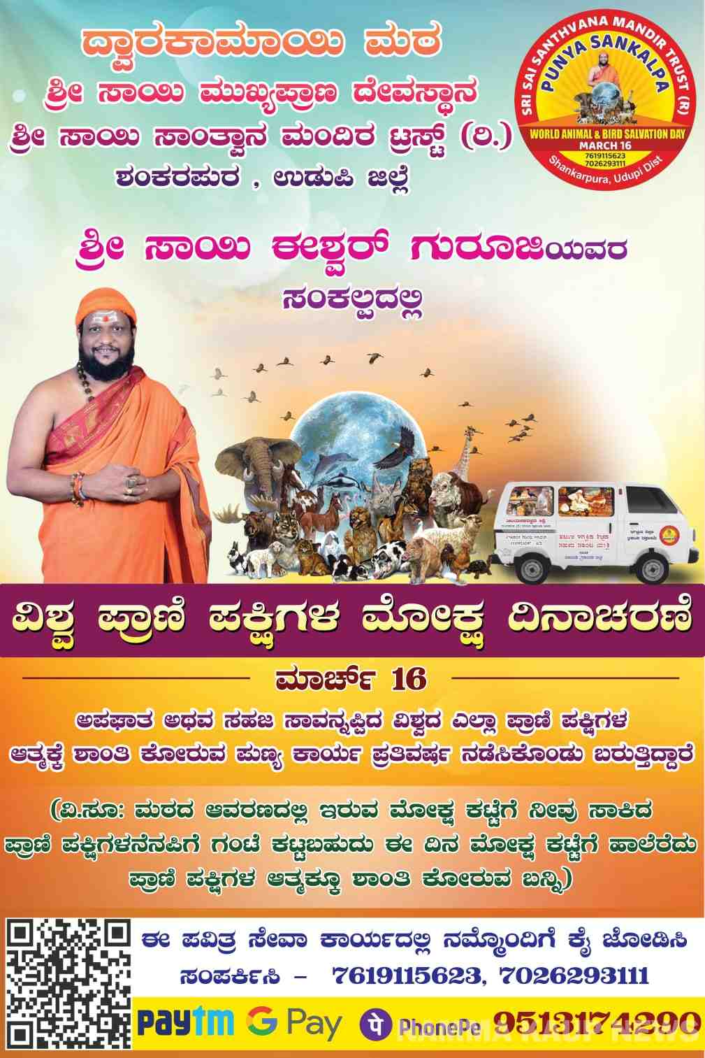 ಕಟಪಾಡಿ : ಶ್ರೀ ದ್ವಾರಕಾಮಾಯಿ ಮಠ ಶ್ರೀ ಸಾಯಿ ಮುಖ್ಯಪ್ರಾಣ ದೇವಸ್ಥಾನ ಶ್ರೀ ಕ್ಷೇತ್ರ ಶಂಕರಪುರ ಇದರ ವತಿಯಿಂದ ವಿಶ್ವ ಪ್ರಾಣಿ ಪಕ್ಷಿಗಳ ಮೋಕ್ಷ ದಿನಾಚರಣೆ ಕಾರ್ಯಕ್ರಮ ಮಾರ್ಚ್ 16ರಂದು ದೇವಾಲಯದ ವಠಾರದಲ್ಲಿ ನಡೆಯಿತು.
