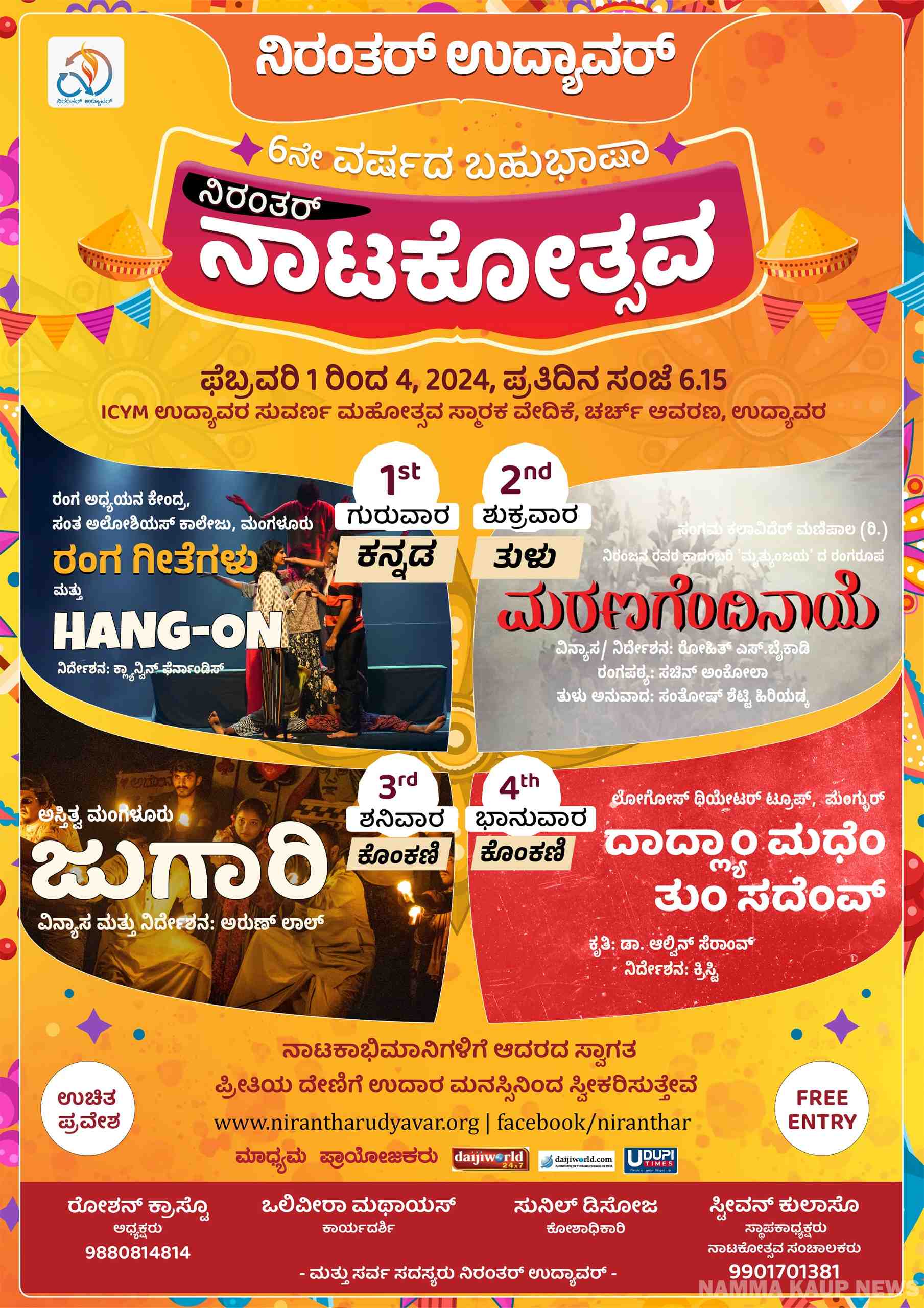 ಉದ್ಯಾವರ : ನಿರಂತರ್ ಉದ್ಯಾವರ ನೇತೃತ್ವದಲ್ಲಿ 6ನೇ ವರ್ಷದ ನಿರಂತರ್ ಬಹುಭಾಷಾ ನಾಟಕೋತ್ಸವವು ಇದೇ ಫೆಬ್ರವರಿ ಒಂದರಿಂದ ನಾಲ್ಕನೇ ತಾರೀಖಿನವರೆಗೆ ಸಂಜೆ ಗಂಟೆ 6:30ಕ್ಕೆ ಸರಿಯಾಗಿ ಐಸಿವೈಎಂ ಉದ್ಯಾವರ ಸುವರ್ಣ ಮಹೋತ್ಸವ ಸ್ಮಾರಕ ವೇದಿಕೆಯಲ್ಲಿ (ಚರ್ಚ್ ವಠಾರ) ನಡೆಯಲಿದೆ.