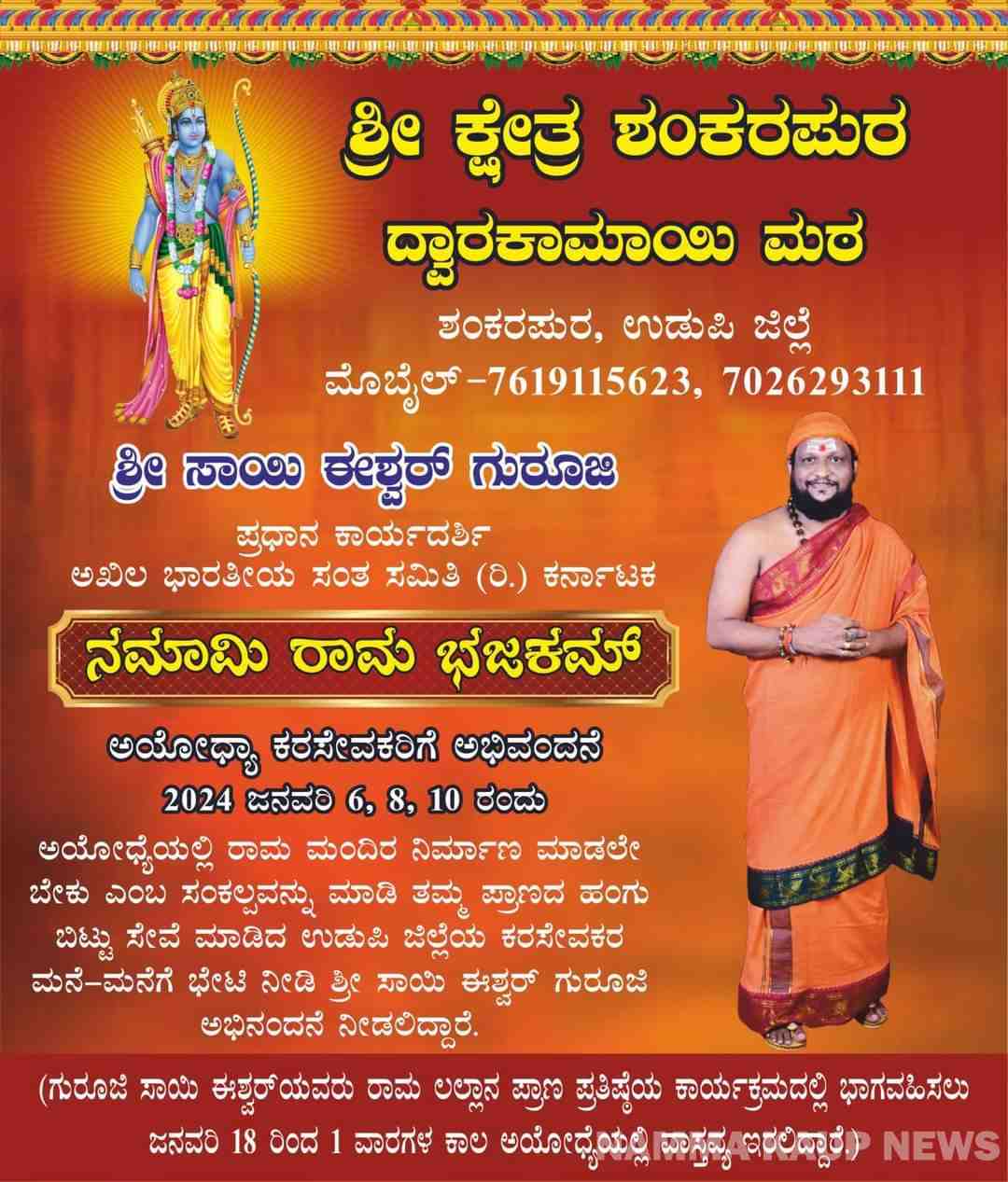 ಶಂಕರಪುರ : ನಮಾಮಿ ರಾಮ ಭಜಕಮ್ ಕಾರ್ಯಕ್ರಮದಡಿ ಕರ್ನಾಟಕ ಅಖಿಲ ಭಾರತೀಯ ಸಂತ ಸಮಿತಿಯ ಪ್ರಧಾನ ಕಾರ್ಯದರ್ಶಿ ಶ್ರೀ ಕ್ಷೇತ್ರ ಶಂಕರಪುರ ದ್ವಾರಕಾಮಾಯಿ ಮಠದ ಶ್ರೀ ಸಾಯಿ ಈಶ್ವರ್ ಗುರೂಜಿ ಅವರು ಅಯೋಧ್ಯೆಯಲ್ಲಿ ರಾಮ ಮಂದಿರ ನಿರ್ಮಾಣ ಮಾಡಲೇಬೇಕು ಎಂಬ ಸಂಕಲ್ಪವನ್ನು ಮಾಡಿ ತಮ್ಮ ಪ್ರಾಣದ ಹಂಗು ತೊರೆದು ಸೇವೆ ಮಾಡಿದ ಉಡುಪಿ ಜಿಲ್ಲೆಯ ಕರಸೇವಕರ ಮನೆ-ಮನೆಗೆ ಜನವರಿ 6,8,10 ರಂದು ಭೇಟಿ ನೀಡಿ ಅಭಿನಂದನೆ ನೀಡಲಿದ್ದಾರೆ ಎಂದು ಮಠದ ಪ್ರಕಟನೆ ತಿಳಿಸಿದೆ.
