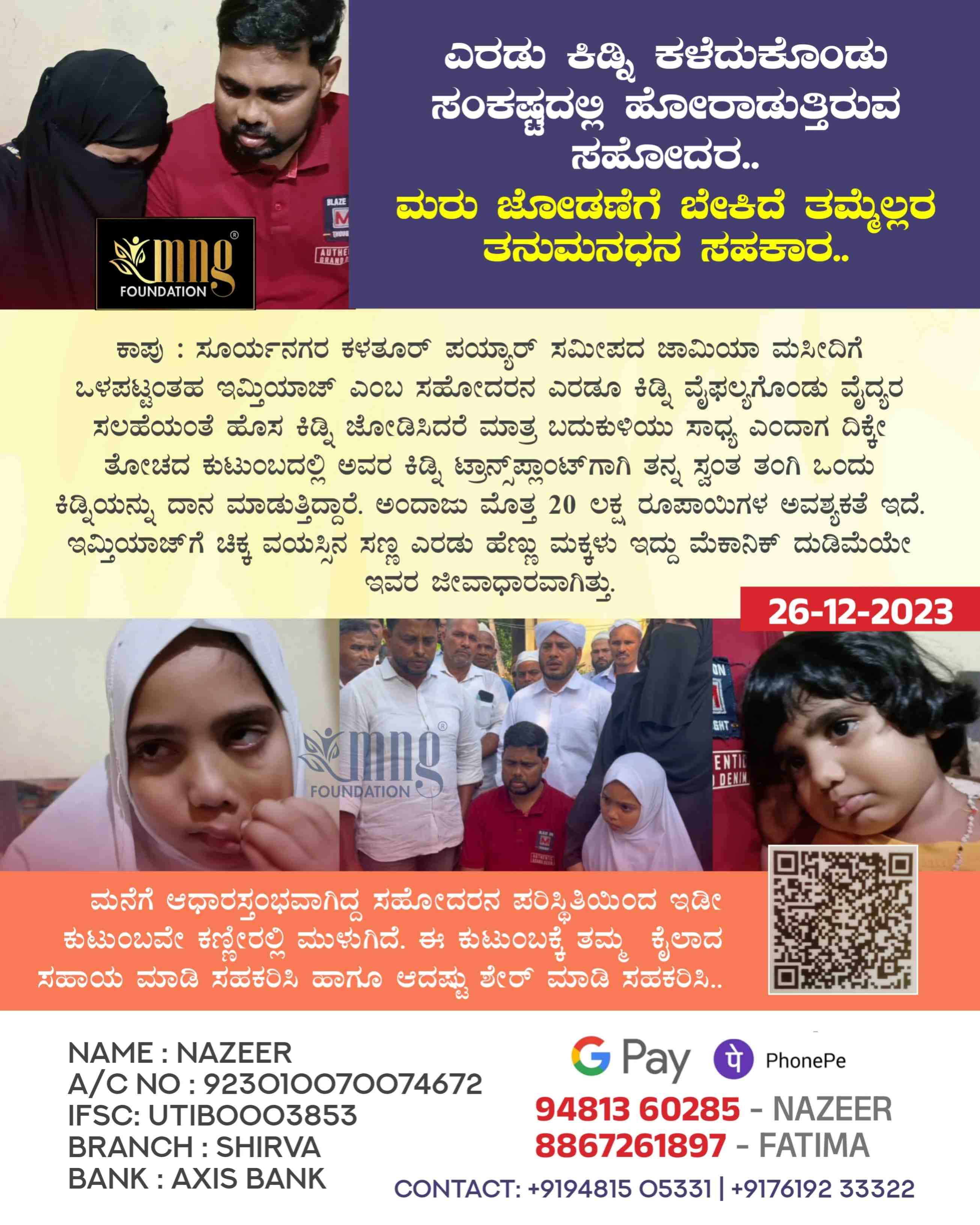 ಕಾಪು : ಸೂರ್ಯನಗರ ಕಳತೂರ್ ಪಯ್ಯಾರ್ ಸಮೀಪದ ಜಾಮಿಯಾ ಮಸೀದಿಗೆ ಒಳಪಟ್ಟಂತಹ ಪರೀಧಾ ಎಂಬ ತಾಯಿಯ ಮಗನಾದ ಇಮ್ತಿಯಾಜ್ ಎಂಬ ಸಹೋದರನ ಎರಡೂ ಕಿಡ್ನಿ ವೈಫಲ್ಯಗೊಂಡು ವೈದ್ಯರ ಸಲಹೆಯಂತೆ ಹೊಸ ಕಿಡ್ನಿ ಜೋಡಿಸಿದರೆ ಮಾತ್ರ ಬದುಕುಳಿಯಲು ಸಾಧ್ಯ ಎಂದಾಗ ದಿಕ್ಕೇ ತೋಚದ ಕುಟುಂಬದಲ್ಲಿ ಅವರ ಕಿಡ್ನಿ ಮರುಜೋಡಣೆಗಾಗಿ ತನ್ನ ಸ್ವಂತ ತಂಗಿ ಒಂದು ಕಿಡ್ನಿಯನ್ನು ದಾನ ಮಾಡುತ್ತಿದ್ದಾರೆ.