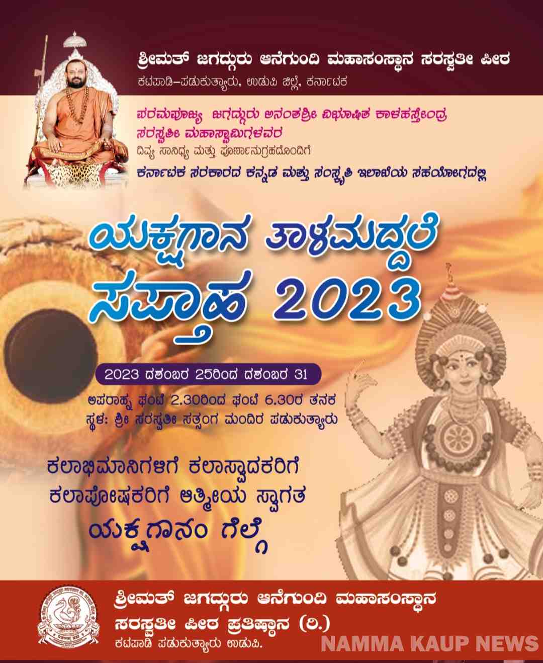 ಪಡುಕುತ್ಯಾರು : ಕಟಪಾಡಿ ಶ್ರೀಮತ್ ಜಗದ್ಗುರು ಆನೆಗುಂದಿ ಮಹಾಸಂಸ್ಥಾನ ಸರಸ್ವತೀ ಪೀಠದಲ್ಲಿ 2023 ದಶಂಬರ 25ರಿಂದ ದಶಂಬರ 31ರವರೆಗೆ ತೃತೀಯ ವರ್ಷದ ಯಕ್ಷಗಾನ ತಾಳಮದ್ದಲೆ ಸಪ್ತಾಹ 2023 ನಡೆಯಲಿದೆ.