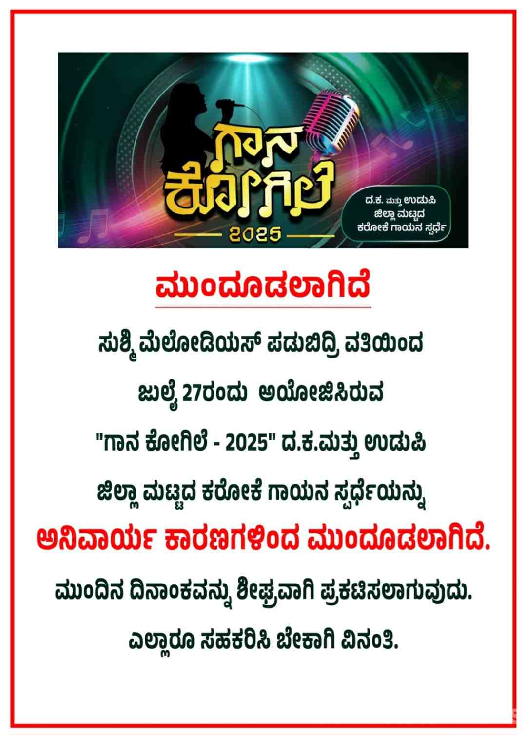 ಜುಲೈ 27ರಂದು ಅಯೋಜಿಸಿರುವ ಗಾನ ಕೋಗಿಲೆ - 2025 ಮುಂದೂಡಿಕೆ