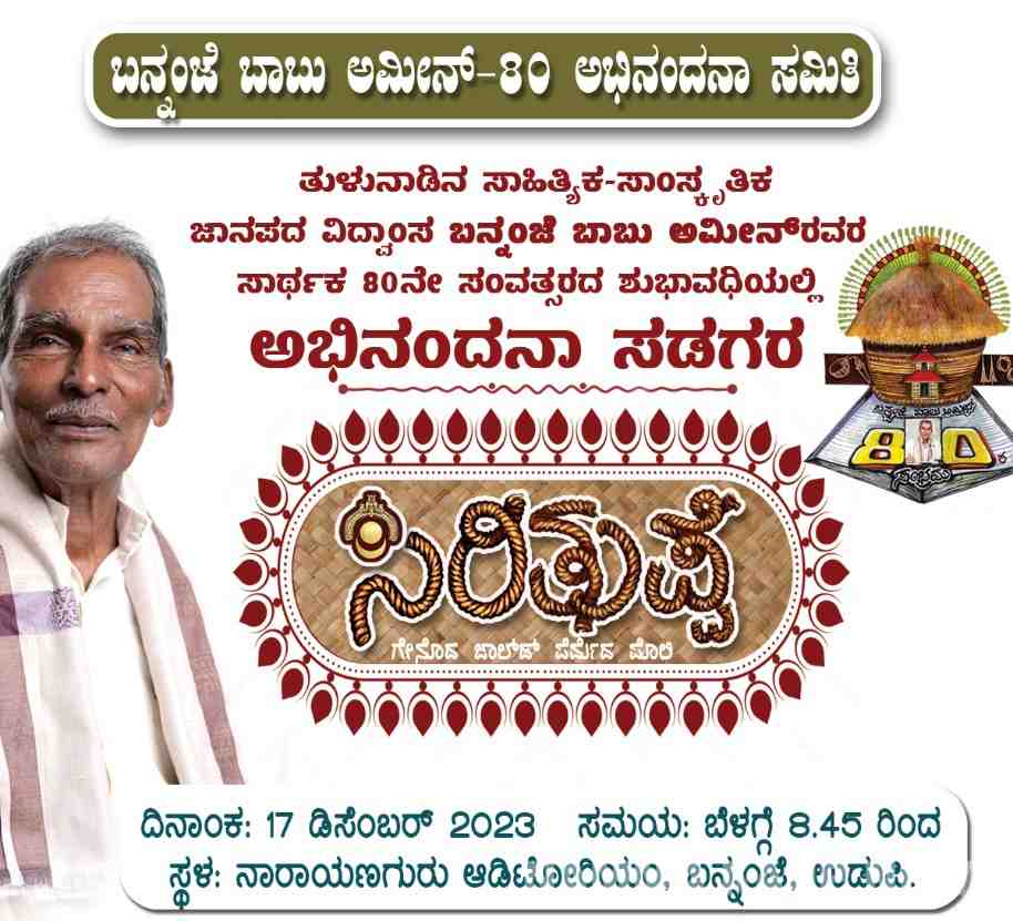 ಡಿಸೆಂಬರ್ 17 : ಜಾನಪದ ವಿದ್ವಾಂಸ ಬನ್ನಂಜೆ ಬಾಬು ಅಮೀನ್ 80 ; ಅಭಿನಂದನೆ ಕಾರ್ಯಕ್ರಮ - 'ಸಿರಿ ತುಪ್ಪೆ'