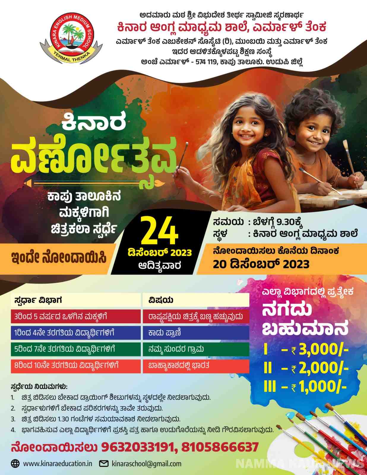 ಎರ್ಮಾಳು : ತೆಂಕ ಕಿನಾರ ಆಂಗ್ಲ ಮಾಧ್ಯಮ ಶಾಲೆಯ ವತಿಯಿಂದ ಕಾಪು ತಾಲೂಕು ವ್ಯಾಪ್ತಿಯ ಮಕ್ಕಳಿಗೆ ಕಿನಾರ ವರ್ಣೋತ್ಸವ ಚಿತ್ರಕಲಾ ಸ್ಪರ್ಧೆ 24 ಡಿಸೆಂಬರ್ 2023 ನೇ ಅದಿತ್ಯವಾರ ಬೆಳಿಗ್ಗೆ ಗಂಟೆ 9.30ಕ್ಕೆ ಕಿನಾರ ಆಂಗ್ಲ ಮಾಧ್ಯಮ ಶಾಲೆಯಲ್ಲಿ ನಡೆಯಲಿದೆ.