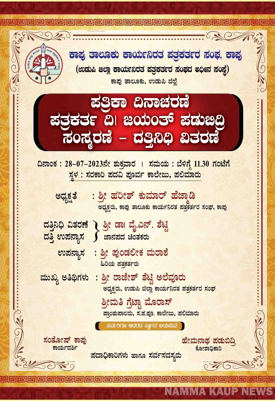 ಜುಲೈ 28 : ಪತ್ರಿಕಾ ದಿನಾಚರಣೆ, ಪತ್ರಕರ್ತ ದಿ। ಜಯಂತ್ ಪಡುಬಿದ್ರಿ ಸಂಸ್ಮರಣೆ – ದತ್ತಿನಿಧಿ ವಿತರಣೆ ಕಾರ್ಯಕ್ರಮ