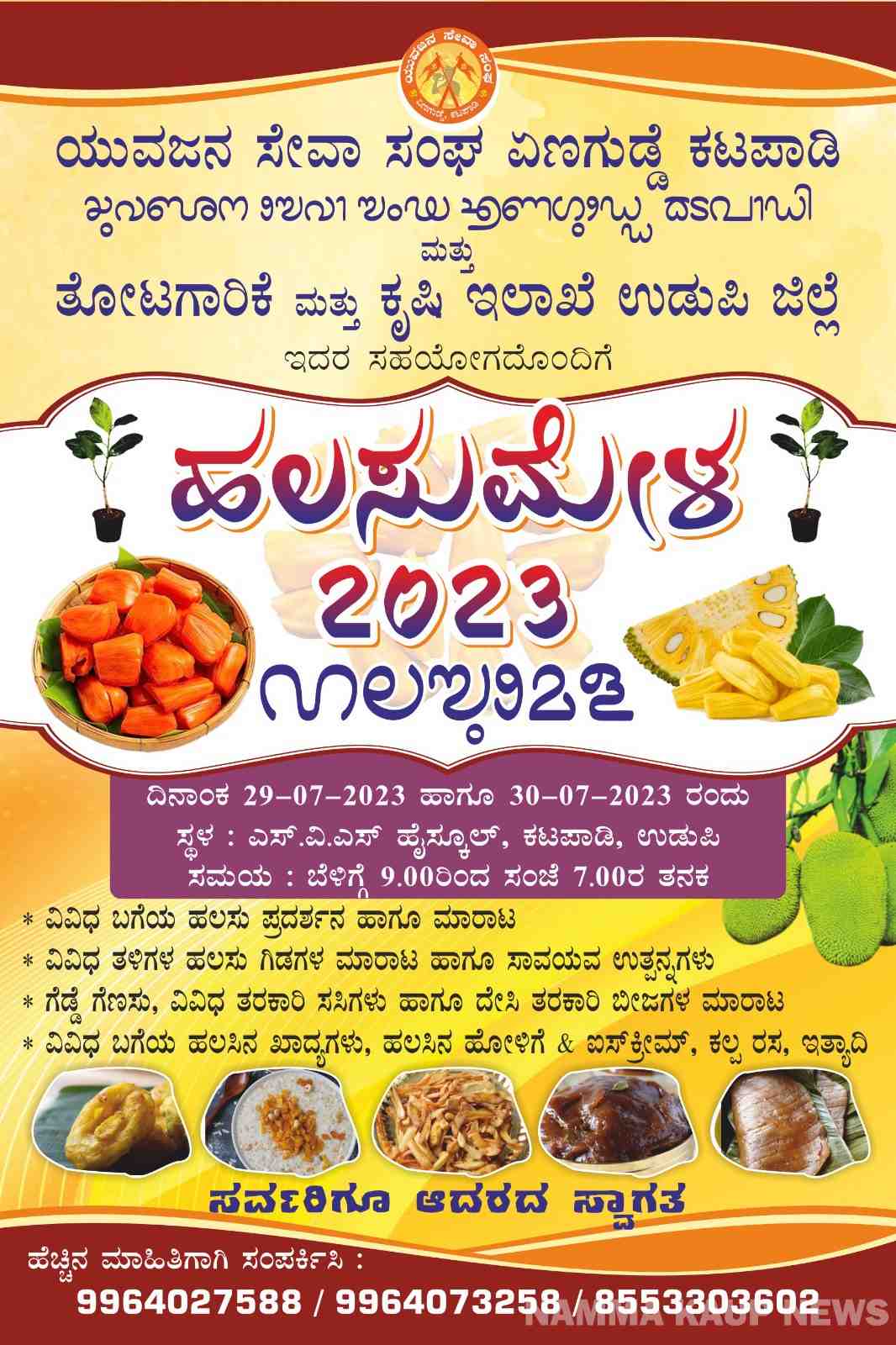 ಕಟಪಾಡಿ : ಯುವ ಜನ ಸೇವಾ ಸಂಘ ಏಣಗುಡ್ಡೆ ಕಟಪಾಡಿ ಹಾಗೂ ತೋಟಗಾರಿಕೆ ಮತ್ತು ಕೃಷಿ ಇಲಾಖೆ ಉಡುಪಿ ಇದರ ಸಹಯೋಗ ದೊಂದಿಗೆ ಜುಲೈ 29 ಮತ್ತು 30 ರಂದು ಕಟಪಾಡಿಯ ಎಸ್.ವಿ.ಎಸ್ ಹೈಸ್ಕೂಲ್ ನಲ್ಲಿ ಪ್ರಥಮ ಬಾರಿಗೆ 2 ದಿನದ ಹಲಸು ಮೇಳವನ್ನು ಆಯೋಜಿಸಲಾಗಿದೆ.