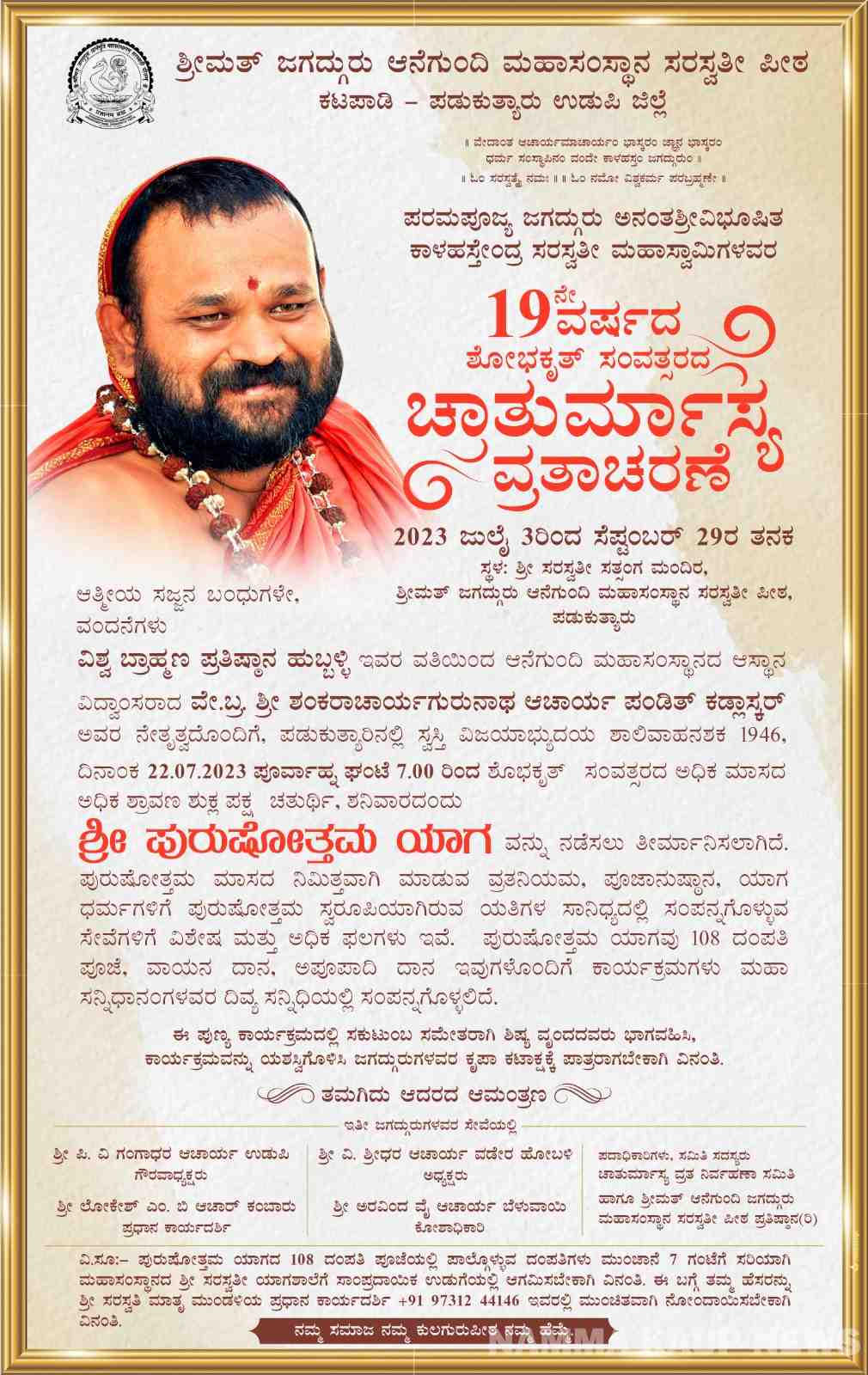 ಜುಲೈ 22 : ಪಡುಕುತ್ಯಾರು ಶ್ರೀಮತ್ ಜಗದ್ಗುರು ಆನೆಗುಂದಿ ಮಹಾಸಂಸ್ಥಾನ ಸರಸ್ವತೀ ಪೀಠದಲ್ಲಿ ಶ್ರೀ ಪುರುಷೋತ್ತಮ ಯಾಗ