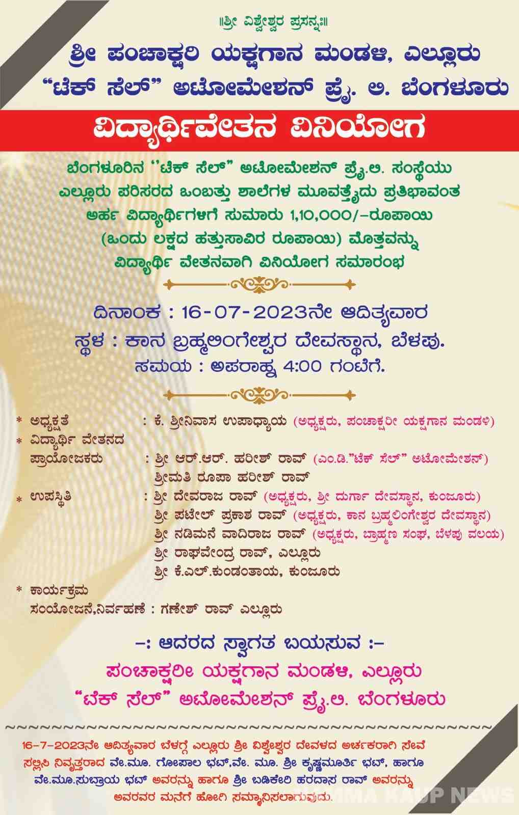 ಕಾಪು : ಶ್ರೀ ಪಂಚಾಕ್ಷರಿ ಯಕ್ಷಗಾನ ಮಂಡಳಿ, ಎಲ್ಲೂರು ಟೆಕ್ ಸೆಲ್ ಅಟೋಮೇಶನ್ ಪ್ರೈ. ಲಿ. ಬೆಂಗಳೂರು ಇವರ ಜಂಟಿ ಆಶ್ರಯದಲ್ಲಿ ಜುಲೈ 16, ಆದಿತ್ಯವಾರ ಸಂಜೆ 4 ಗಂಟೆಗೆ ಕಾನ ಬ್ರಹ್ಮಲಿಂಗೇಶ್ವರ ದೇವಸ್ಥಾನ, ಬೆಳಪು ಇಲ್ಲಿ ವಿದ್ಯಾರ್ಥಿವೇತನ ವಿನಿಯೋಗ ಕಾರ್ಯಕ್ರಮ ಜರಗಲಿದೆ.