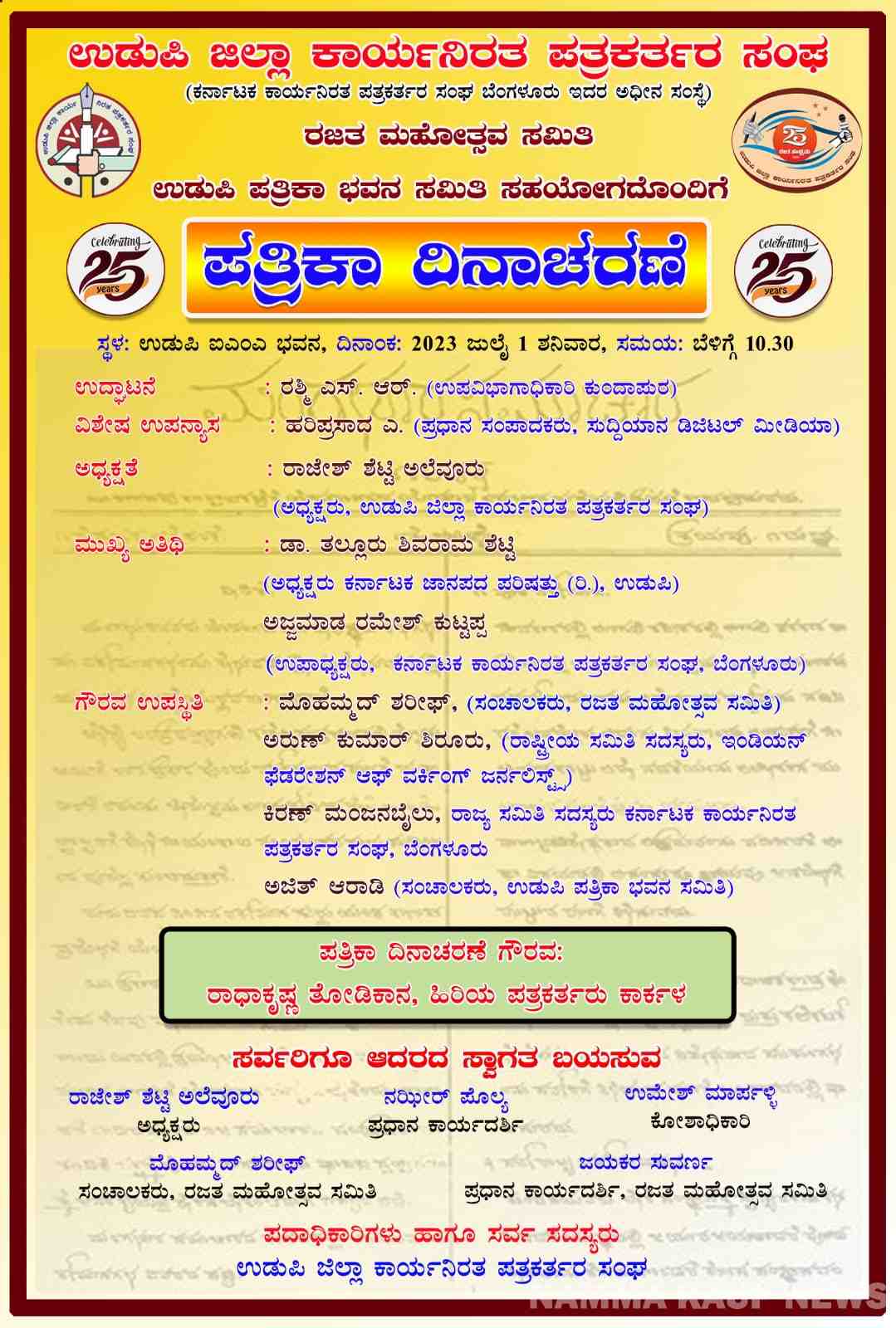 ಉಡುಪಿ : ಜಿಲ್ಲಾ ಕಾರ್ಯನಿರತ ಪತ್ರಕರ್ತರ ಸಂಘ ರಜತ ಮಹೋತ್ಸವ ಸಮಿತಿ, ಉಡುಪಿ ಪತ್ರಿಕಾ ಭವನ ಸಮಿತಿಯ ಸಹಯೋಗದೊಂದಿಗೆ ಪತ್ರಿಕಾ ದಿನಾಚರಣೆಯನ್ನು ಉಡುಪಿ ಐಎಂಎ ಭವನದಲ್ಲಿ ಜುಲೈ 1ರಂದು ಬೆಳಗ್ಗೆ 10.30ಕ್ಕೆ ಹಮ್ಮಿಕೊಳ್ಳಲಾಗಿದೆ.