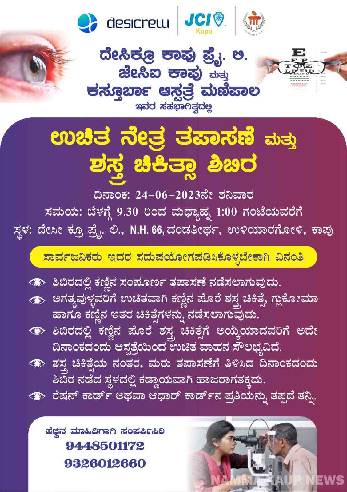 ಕಾಪು : ದೇಸಿಕ್ರೂ ಕಾಪು ಪ್ರೈ.ಲಿ., ಜೇಸಿಐ ಕಾಪು ಮತ್ತು ಕಸ್ತೂರ್ಬಾ ಆಸ್ಪತ್ರೆ ಮಣಿಪಾಲ ಇವರ ಸಹಭಾಗಿತ್ವದಲ್ಲಿ ಉಚಿತ ನೇತ್ರ ತಪಾಸಣೆ ಮತ್ತು ಶಸ್ತ್ರ ಚಿಕಿತ್ಸಾ ಶಿಬಿರ ಜೂನ್ 24, ಶನಿವಾರ ಬೆಳಗ್ಗೆ 9.30 ರಿಂದ ಮಧ್ಯಾಹ್ನ 1 ಗಂಟೆಯವರೆಗೆ ದೇಸೀ ಕ್ರೂ ಪ್ರೈ. ಲಿ., N.H. 66, ದಂಡತೀರ್ಥ, ಉಳಿಯಾರಗೋಳಿ, ಕಾಪು ಇಲ್ಲಿ ನಡೆಯಲಿದೆ.
