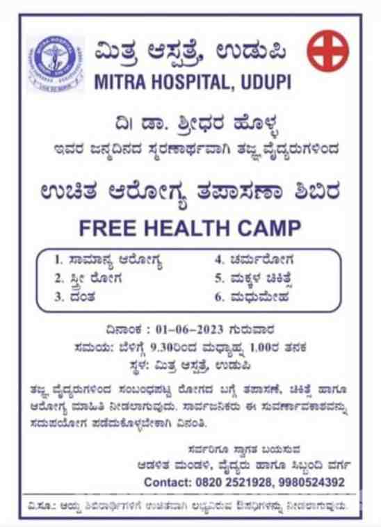 ಉಡುಪಿ: ಮಿತ್ರ ಆಸ್ಪತ್ರೆ ಉಡುಪಿ ದಿ| ಡಾ. ಶ್ರೀಧರ ಹೊಳ್ಳ ಇವರ ಜನ್ಮದಿನದ ಸ್ಮರಣಾರ್ಥ ತಜ್ಞ ವೈದ್ಯರುಗಳಿಂದ ಉಚಿತ ಆರೋಗ್ಯ ತಪಾಸಣಾ ಶಿಬಿರ.