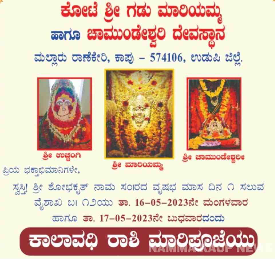 ಕಾಪು : ಇಲ್ಲಿನ ಮಲ್ಲಾರು ರಾಣೆಕೇರಿಯ ಕೋಟೆ ಶ್ರೀ ಗಡು ಮಾರಿಯಮ್ಮ ಹಾಗೂ ಚಾಮುಂಡೇಶ್ವರಿ ದೇವಸ್ಥಾನದಲ್ಲಿ ಕಾಲಾವಧಿ ರಾಶಿ ಮಾರಿಪೂಜೆಯು ಮೇ 16, ಮಂಗಳವಾರ ಹಾಗೂ ಮೇ 17, ಬುಧವಾರದಂದು ಜರಗಲಿದೆ.