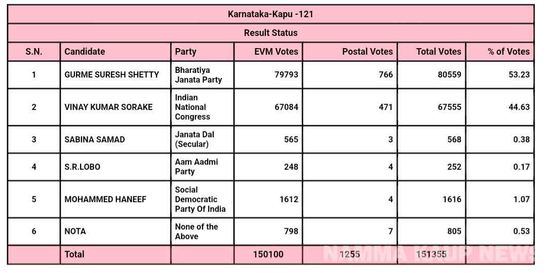 ಕಾಪು : ವಿಧಾನಸಭಾ ಕ್ಷೇತ್ರದ ಬಿಜೆಪಿ ಅಭ್ಯರ್ಥಿ ಗುರ್ಮೆ ಸುರೇಶ್ ಶೆಟ್ಟಿಯವರು ಕಾಂಗ್ರೆಸ್ ಅಭ್ಯರ್ಥಿ ವಿನಯ್ ಕುಮಾರ್ ಸೊರಕೆಯನ್ನು ಸೋಲಿಸಿ ಭರ್ಜರಿ ಗೆಲುವು ಸಾಧಿಸಿದ್ದಾರೆ.
