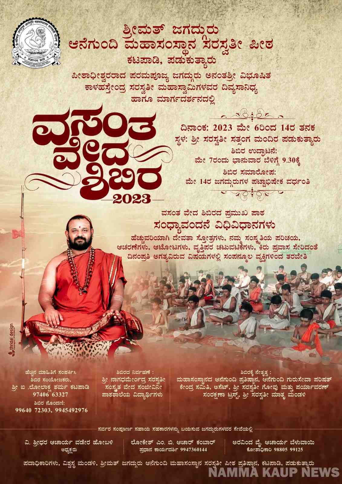 ಕಾಪು : ತಾಲೂಕಿನ ಪಡು ಕುತ್ಯಾರು ಶ್ರೀಮತ್ ಜಗದ್ಗುರು ಆನೆಗುಂದಿ ಮಹಾಸಂಸ್ಥಾನ ಸರಸ್ವತಿ ಪೀಠದಲ್ಲಿ ವರ್ಷಂಪ್ರತಿ ನಡೆಸಲಾಗುವ ವಸಂತ ವೇದ ಶಿಬಿರವು ಮೇ 7ರಿಂದ ಆರಂಭಗೊಳ್ಳಲಿದೆ. ಮೇ 6ರಂದು ಶಿಬಿರ ವಿದ್ಯಾರ್ಥಿಗಳ ನೋಂದಣಿ ಪೂರ್ಣಗೊಳ್ಳಲಿದೆ.
