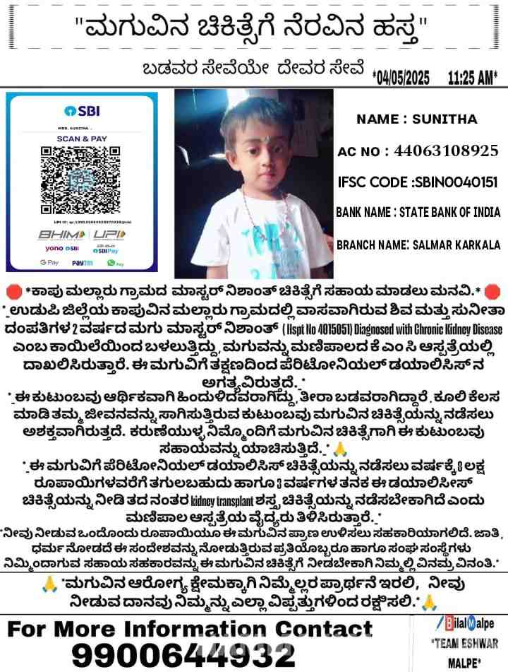 ಕಾಪು : ಇಲ್ಲಿನ ಮಲ್ಲಾರು ಗ್ರಾಮದಲ್ಲಿ ವಾಸವಾಗಿರುವ ಶಿವ ಮತ್ತು ಸುನೀತಾ ದಂಪತಿಗಳ 2 ವರ್ಷದ ಮಗು (Hspt No 4015051) Diagnosed with Chronic Kidney Disease ಎಂಬ ಕಾಯಿಲೆಯಿಂದ ಬಳಲುತ್ತಿದ್ದು, ಮಗುವನ್ನು ಮಣಿಪಾಲದ ಕೆ ಎಂ ಸಿ ಆಸ್ಪತ್ರೆಯಲ್ಲಿ ದಾಖಲಿಸಿರುತ್ತಾರೆ. ಈ ಮಗುವಿಗೆ ತಕ್ಷಣದಿಂದ ಪೆರಿಟೋನಿಯಲ್ ಡಯಾಲಿಸಿಸ್ನ ಅಗತ್ಯವಿರುತ್ತದೆ. ಈ ಕುಟುಂಬವು ಆರ್ಥಿಕವಾಗಿ ಹಿಂದುಳಿದವರಾಗಿದ್ದು ತೀರಾ ಬಡವರಾಗಿದ್ದಾರೆ. ಕೂಲಿ ಕೆಲಸ ಮಾಡಿ ತಮ್ಮ ಜೀವನವನ್ನು ಸಾಗಿಸುತ್ತಿರುವ ಕುಟುಂಬವು ಮಗುವಿನ ಚಿಕಿತ್ಸೆಯನ್ನು ನಡೆಸಲು ಅಶಕ್ತವಾಗಿರುತ್ತದೆ. ಕರುಣೆಯುಳ್ಳ ನಿಮ್ಮೊಂದಿಗೆ ಮಗುವಿನ ಚಿಕಿತ್ಸೆಗಾಗಿ ಈ ಕುಟುಂಬವು ಸಹಾಯವನ್ನು ಯಾಚಿಸುತ್ತಿದೆ