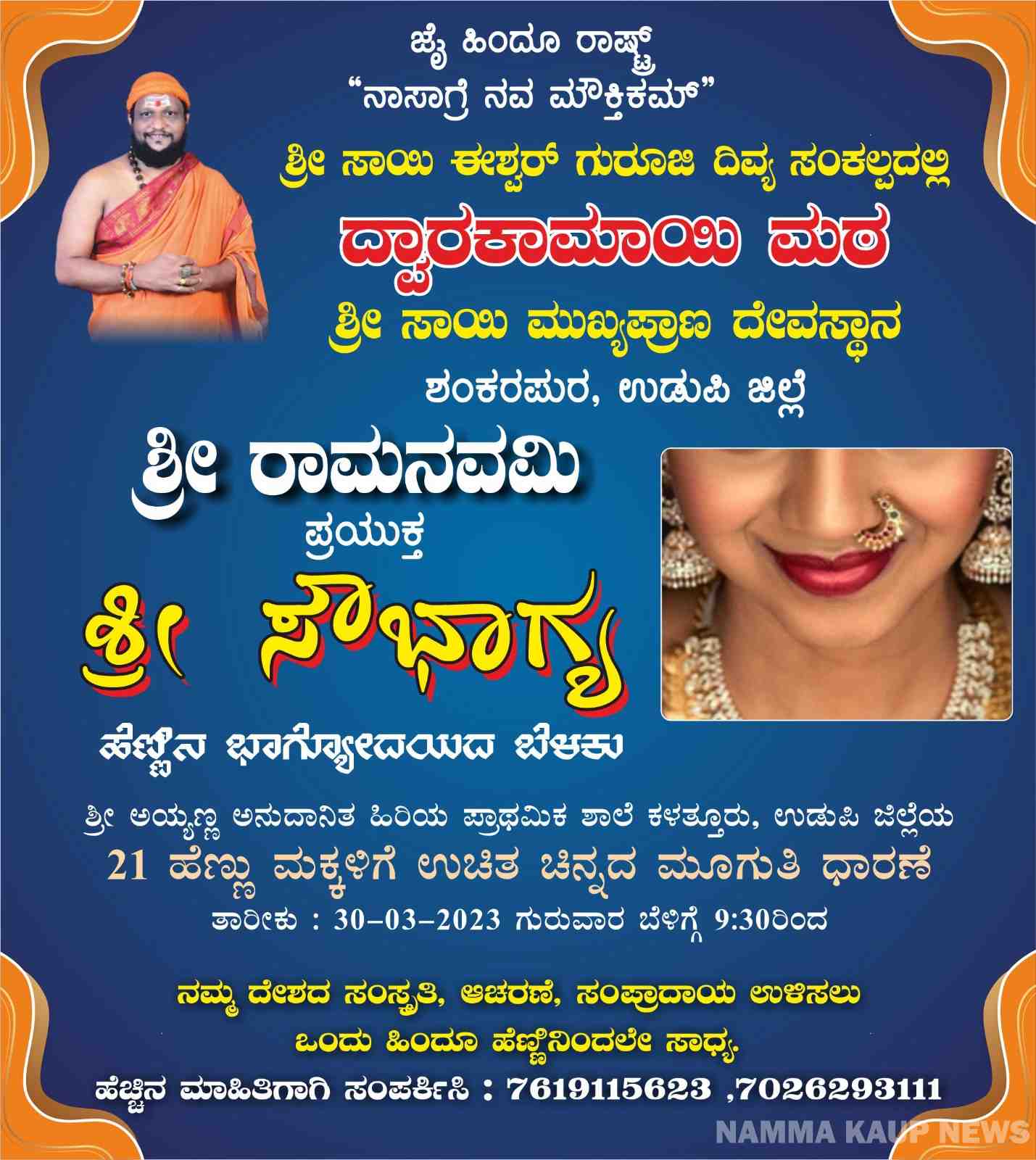 ಕಾಪು : ತಾಲೂಕಿನ ಶಂಕರಪುರ ದ್ವಾರಕಾಮಾಯಿ ಮಠ ಶ್ರೀ ಸಾಯಿ ಮುಖ್ಯಪ್ರಾಣ ದೇವಸ್ಥಾನದ ಶ್ರೀ ಸಾಯಿ ಈಶ್ವರ್ ಗುರೂಜಿ ಅವರಿಂದ ಹೆಣ್ಣು ಮಕ್ಕಳಿಗೆ ಉಚಿತ ಚಿನ್ನದ ಮೂಗುತಿ ಧಾರಣೆಯೊಂದಿಗೆ ವಿಶಿಷ್ಟವಾಗಿ ಶ್ರೀ ರಾಮನವಮಿಯ ಆಚರಣೆಯು ಶ್ರೀ ಸೌಭಾಗ್ಯ ಹೆಣ್ಣುಮಕ್ಕಳ ಭಾಗ್ಯೋದಯದ ಬೆಳಕು ಎಂಬ ಸೇವಾ ಕಾರ್ಯಕ್ರಮದ ಮೂಲಕ ಮಾಚ್೯ 30ರಂದು ಬೆಳಿಗ್ಗೆ 9 ಗಂಟೆಗೆ ಶಂಕರಪುರ ದ್ವಾರಕಾಮಾಯಿ ಮಠದಲ್ಲಿ ಜರಗಲಿದೆ.