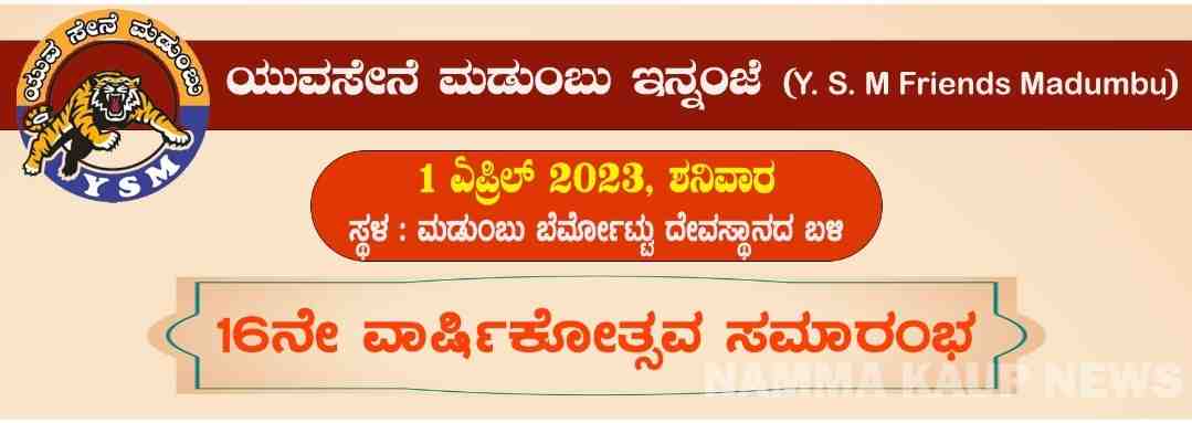 ಕಾಪು : ಯುವಸೇನೆ ಮಡುಂಬು ಇನ್ನಂಜೆ ಇದರ 16ನೇ ವಾರ್ಷಿಕೋತ್ಸವ ಸಮಾರಂಭ ಏಪ್ರಿಲ್ 1, ಶನಿವಾರದಂದು ಮಡುಂಬು ಬೆರ್ಮೋಟ್ಟು ದೇವಸ್ಥಾನದ ಬಳಿ ನಡೆಯಲಿದೆ.