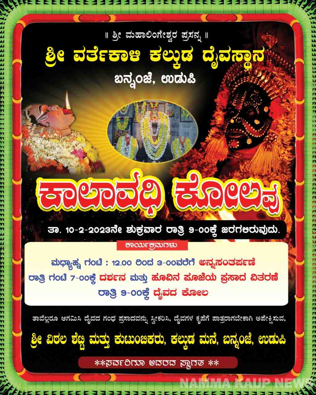 ಉಡುಪಿ : ಶ್ರೀ ವರ್ತೆಕಾಳಿ ಕಲ್ಲುಡ ದೈವಸ್ಥಾನ ಬನ್ನಂಜೆ, ಉಡುಪಿ ಇಲ್ಲಿ ಫೆಬ್ರವರಿ 10, ಶುಕ್ರವಾರ ರಾತ್ರಿ 9ಕ್ಕೆ ಕಾಲಾವಧಿ ಕೋಲ ಜರಗಲಿದೆ.