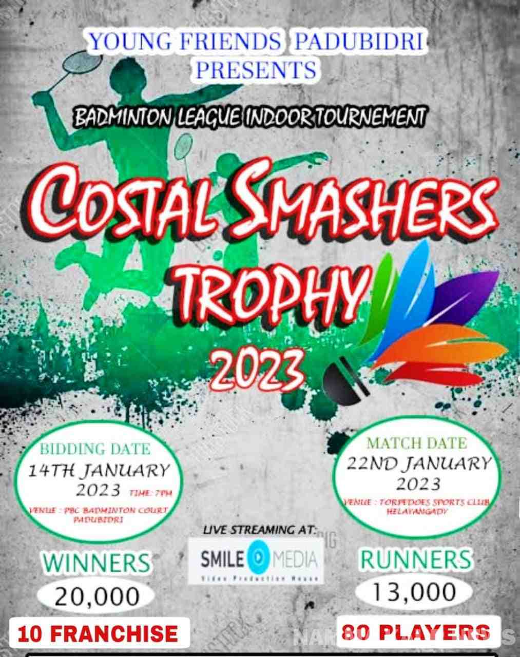 ಜನವರಿ 22 : ಯಂಗ್ ಫ್ರೆಂಡ್ಸ್ ಪಡುಬಿದ್ರಿ - ಬ್ಯಾಡ್ಮಿಂಟನ್ ಪ್ರೀಮಿಯರ್ ಲೀಗ್ ಕೋಸ್ಟಲ್ ಸ್ಮ್ಯಾಷರ್ಸ್ ಟ್ರೋಫಿ 2023