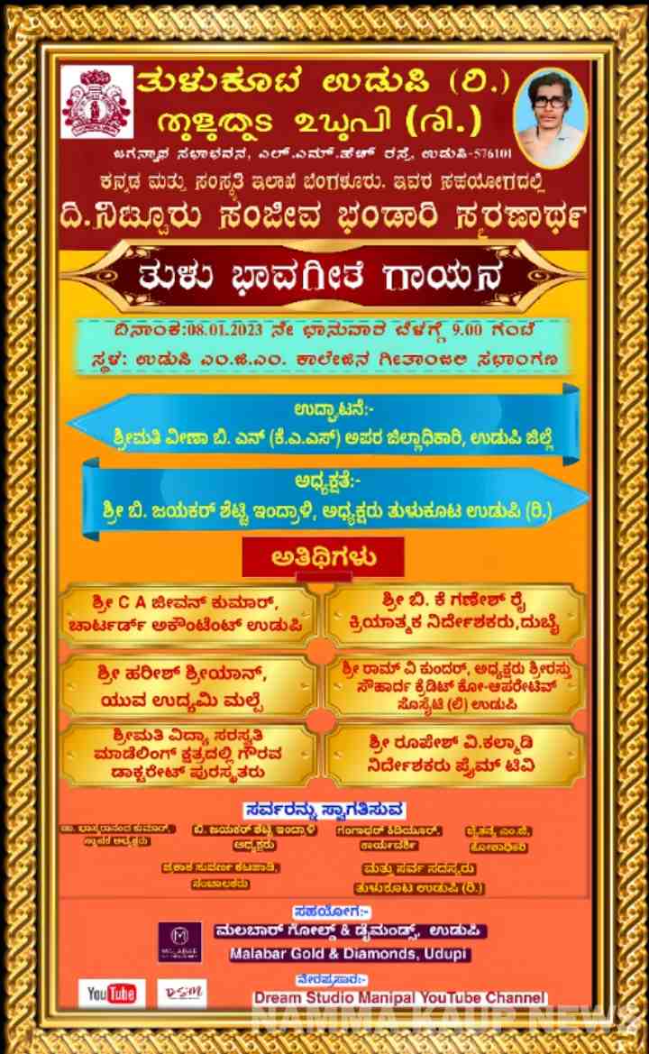 ಜನವರಿ 8 : ತುಳುಕೂಟ ಉಡುಪಿ ವತಿಯಿಂದ ತುಳು ಭಾವಗೀತೆ ಗಾಯನ
