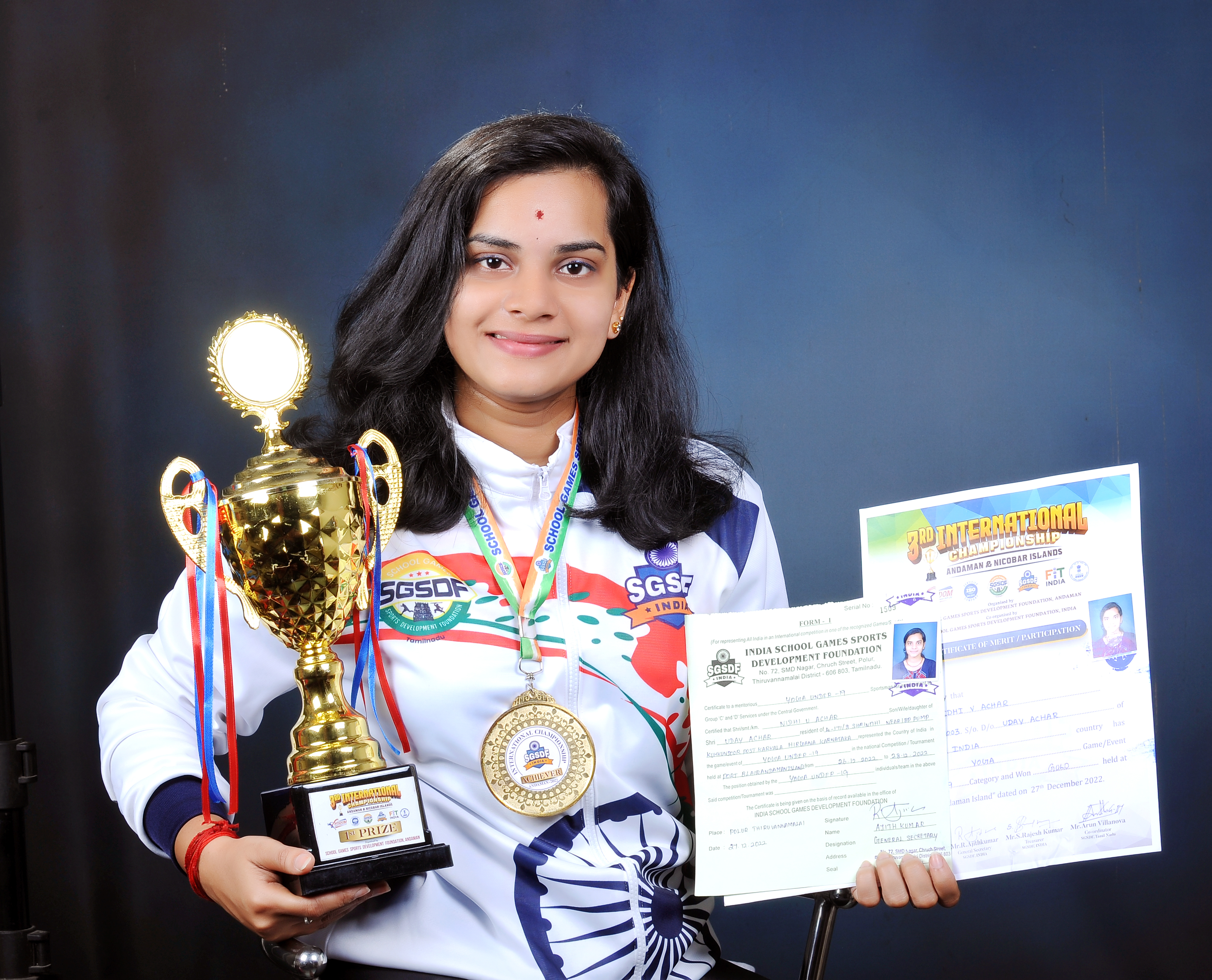 ಕಾರ್ಕಳ : ಅಂಡಮಾನ್ ಮತ್ತು ನಿಕೋಬಾರ್ ದ್ವೀಪದಲ್ಲಿ ಡಿಸೆಂಬರ್ 26ರಿಂದ 28ರವರೆಗೆ ನಡೆದ ಇಂಡಿಯಾ ಸ್ಕೂಲ್ ಗೇಮ್ಸ್ ಸ್ಪೋರ್ಟ್ಸ್ ಫೌಂಡೇಶನ್ ನ (S. G. S. D. F India) ವತಿಯಿಂದ ನಡೆಸಲಾದ ಮೂರನೇ ಅಂತರಾಷ್ಟ್ರೀಯ 19 ವರ್ಷದೊಳಗಿನ ಯೋಗ ಚಾಂಪಿಯನ್ ಶಿಪ್ ನಲ್ಲಿ ಕಾರ್ಕಳ ಕ್ರಿಯೇಟಿವ್ ಕಾಲೇಜಿನ ಪದವಿ ಪೂರ್ವ ವಿದ್ಯಾರ್ಥಿನಿ ನಿಧಿ ಯು ಆಚಾರ್ ಭಾರತವನ್ನು ಪ್ರತಿನಿಧಿಸಿ ಬಂಗಾರದ ಪದಕವನ್ನು ಗಳಿಸಿರುತ್ತಾರೆ.