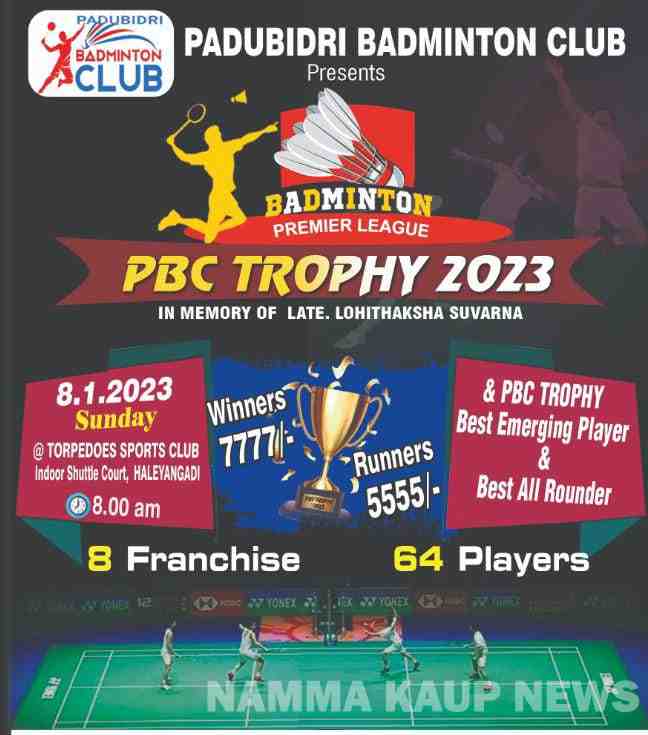 ಪಡುಬಿದ್ರಿ : ಇಲ್ಲಿನ ಪಡುಬಿದ್ರಿ ಬ್ಯಾಡ್ಮಿಂಟನ್ ಕ್ಲಬ್ ಅರ್ಪಿಸುವ ದಿವಂಗತ ಲೋಹಿತಾಕ್ಷ ಸುವರ್ಣ ಸ್ಮರಣಾರ್ಥ ಬ್ಯಾಡ್ಮಿಂಟನ್ ಪ್ರೀಮಿಯರ್ ಲೀಗ್ ಪಿಬಿಸಿ ಟ್ರೋಫಿ 2023 ಇದರ ಉದ್ಘಾಟನೆ ಜನವರಿ 8, ಆದಿತ್ಯವಾರ ಬೆಳಿಗ್ಗೆ 8:30 ಕ್ಕೆ ಹಳೆಯಂಗಡಿಯ ಟೋರ್ಪೆಡೋಸ್ ಸ್ಫೋಟ್೯್ಸ ಕ್ಲಬ್ ನ ಒಳಾಂಗಣ ಶಟಲ್ ಕೋಟ್೯ ಇಲ್ಲಿ ಜರಗಲಿದೆ.