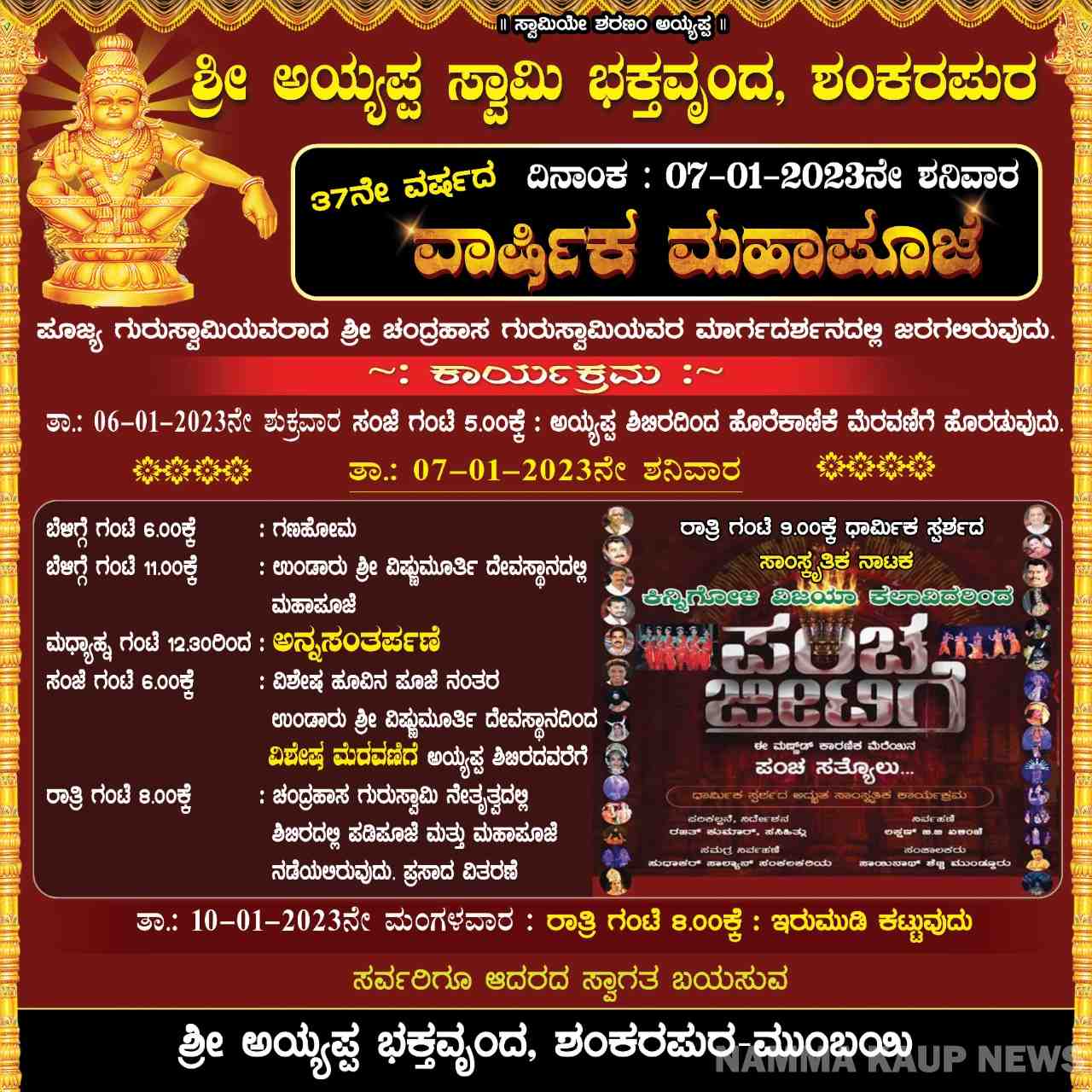 ಜ. 7 : ಚಂದ್ರಹಾಸ ಗುರುಸ್ವಾಮಿ ಇನ್ನಂಜೆಯವರ ಶ್ರೀ ಅಯ್ಯಪ್ಪ ಭಕ್ತವೃಂದ ಶಂಕರಪುರದ 37ನೇ ವಾರ್ಷಿಕ ಅಯ್ಯಪ್ಪ ಮಹಾಪೂಜೆ