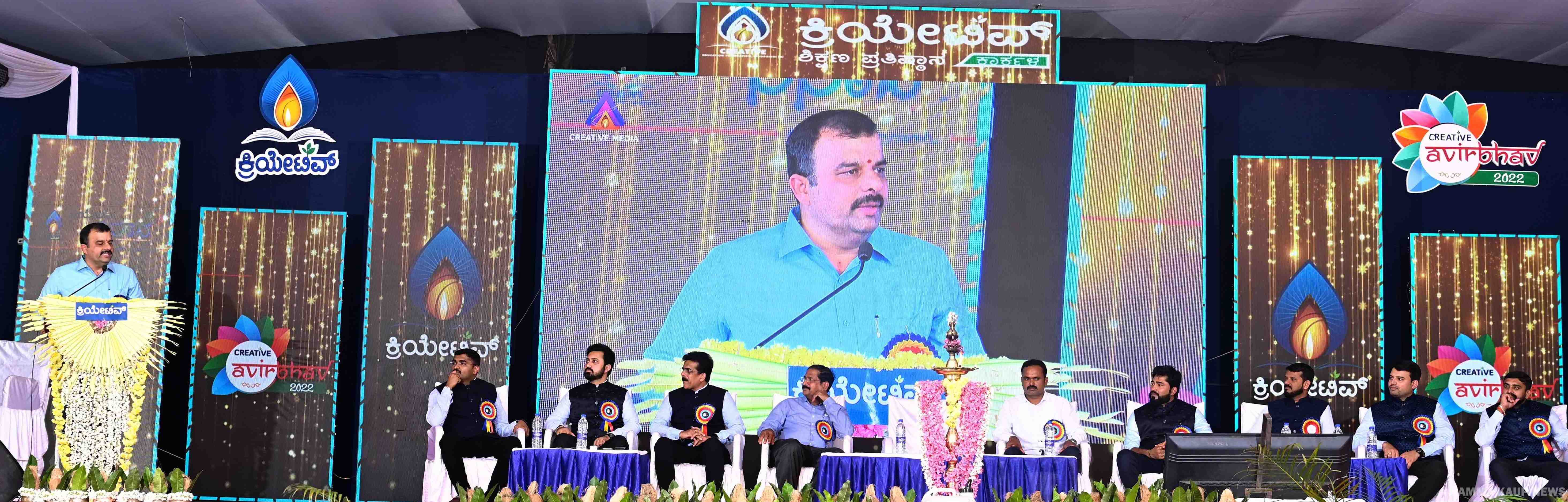 ಕಾರ್ಕಳ : ಗ್ರಾಮೀಣ ಪ್ರದೇಶದಲ್ಲಿ ಕ್ರಿಯೇಟಿವ್ನಂತಹ ವಿದ್ಯಾಸಂಸ್ಥೆಗಳು ಬಂದಲ್ಲಿ ಅಂತಹ ಪ್ರದೇಶ ಅಭಿವೃದ್ಧಿ ಹೊಂದುವುದರ ಜೊತೆಗೆ ಶಿಕ್ಷಣ ಕ್ಷೇತ್ರದಲ್ಲೂ ಉತ್ತಮ ಬದಲಾವಣೆಯಾಗುತ್ತದೆ. ಗ್ರಾಮೀಣ ವಿದ್ಯಾರ್ಥಿಗಳ ಪ್ರತಿಭೆಗೆ ಮನ್ನಣೆ ದೊರೆತಂತೆ ಆಗುತ್ತದೆ ಎಂದು ಮಾನ್ಯ ಇಂಧನ ಮತ್ತು ಕನ್ನಡ ಸಂಸ್ಕೃತಿ ಇಲಾಖೆಯ ಸಚಿವರಾದ ವಿ. ಸುನೀಲ್ ಕುಮಾರ್ ಹೇಳಿದರು. ಕಾರ್ಕಳದ ಕ್ರಿಯೇಟಿವ್ ಕಾಲೇಜಿನಲ್ಲಿ ನಡೆದ ಕ್ರಿಯೇಟಿವ್ ಆವಿರ್ಭವ್ -2022 ರ ವಾರ್ಷಿಕೋತ್ಸವದಲ್ಲಿ ಬಡ ಮತ್ತು ಪ್ರತಿಭಾನ್ವಿತ ವಿದ್ಯಾರ್ಥಿಗಳ ಉಚಿತ ಶಿಕ್ಷಣ ವ್ಯವಸ್ಥೆ ʼಕ್ರಿಯೇಟಿವ್ ಹೊಂಗಿರಣʼ ಯೋಜನೆಯನ್ನು ಉದ್ಘಾಟಿಸಿ ಮಾತನಾಡಿದರು.