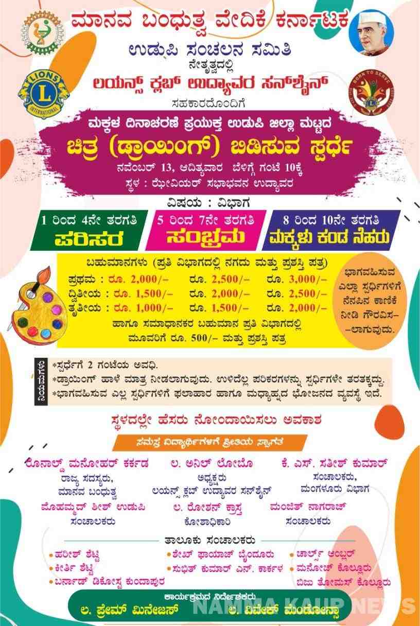 ಉಡುಪಿ : ಮಾನವ ಬಂಧುತ್ವ ವೇದಿಕೆ ಕರ್ನಾಟಕ ಉಡುಪಿ ಜಿಲ್ಲೆ ನೇತೃತ್ವದಲ್ಲಿ ಲಯನ್ಸ್ ಕ್ಲಬ್ ಉದ್ಯಾವರ ಸನ್ ಶೈನ್ ಇವರ ಸಹಕಾರದೊಂದಿಗೆ ಮಕ್ಕಳ ದಿನಾಚರಣೆಯ ಪ್ರಯುಕ್ತ ಉಡುಪಿ ಜಿಲ್ಲಾ ಮಟ್ಟದ ಚಿತ್ರ (ಡ್ರಾಯಿಂಗ್) ಬಿಡಿಸುವ ಇದೇ ನವೆಂಬರ್ 13 ರಂದು ಆದಿತ್ಯವಾರ ಬೆಳಿಗ್ಗೆ 10 ಗಂಟೆಗೆ ಉದ್ಯಾವರ ಝೇವಿಯರ್ ಸಭಾಭವನದಲ್ಲಿ ಜರುಗಲಿದೆ ಎಂದು ಪ್ರಕಟಣೆ ತಿಳಿಸಿದೆ.