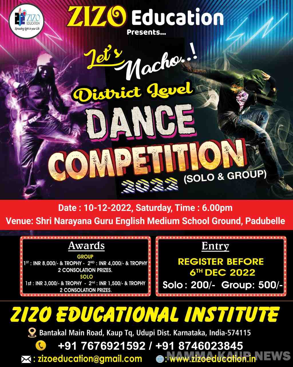 ಕಾಪು : ಝಿಝೋ ಎಜುಕೇಶನ್ ಅರ್ಪಿಸುವ ಲೆಟ್ಸ್ ನಾಚೊ ಜಿಲ್ಲಾ ಮಟ್ಟದ ಸೊಲೊ ಮತ್ತು ಗುಂಪು ನೃತ್ಯ ಸ್ಪರ್ಧೆ 2022 ಡಿಸೆಂಬರ್ 10, ಶನಿವಾರ ಸಂಜೆ 6 ಗಂಟೆಗೆ ಪಡುಬೆಳ್ಳೆ ಶ್ರೀ ನಾರಾಯಣ ಗುರು ಆಂಗ್ಲ ಮಾಧ್ಯಮ ಶಾಲೆಯ ಮೈದಾನದಲ್ಲಿ ಜರಗಲಿದೆ.