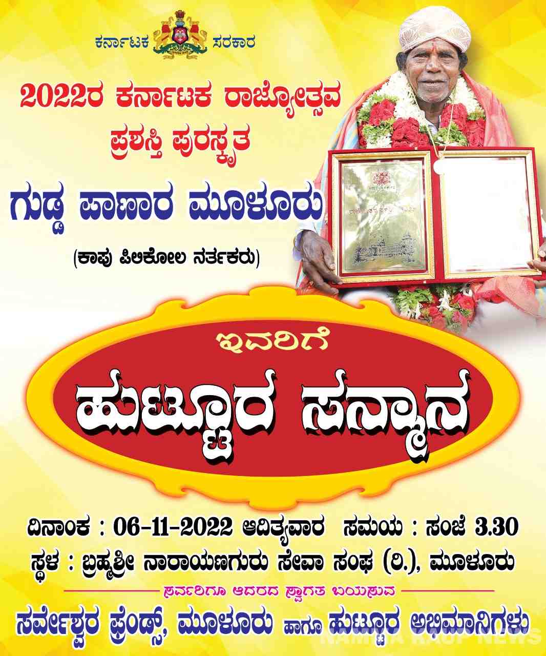 ಕಾಪು : ಈ ಬಾರಿಯ ಕರ್ನಾಟಕ ರಾಜ್ಯೋತ್ಸವ ಪ್ರಶಸ್ತಿ ಪುರಸ್ಕೃತರಾದ ಕಾಪು ತಾಲೂಕಿನ ಮೂಳೂರಿನ ಪಿಲಿ ಕೋಲ ನರ್ತಕರಾದ ಗುಡ್ಡ ಪಾಣಾರ ಅವರಿಗೆ ನವೆಂಬರ್ 6, ಆದಿತ್ಯವಾರದಂದು ಸಂಜೆ ಗಂಟೆ 3:30ಕ್ಕೆ ಮೂಳೂರು ಬ್ರಹ್ಮಶ್ರೀ ನಾರಾಯಣಗುರು ಸೇವಾ ಸಂಘ ಇಲ್ಲಿ ಹುಟ್ಟೂರ ಸನ್ಮಾನ ಕಾರ್ಯಕ್ರಮ ಆಯೋಜಿಸಲಾಗಿದೆ ಎಂದು ಪ್ರಕಟಣೆಯಲ್ಲಿ ತಿಳಿಸಿದ್ದಾರೆ.