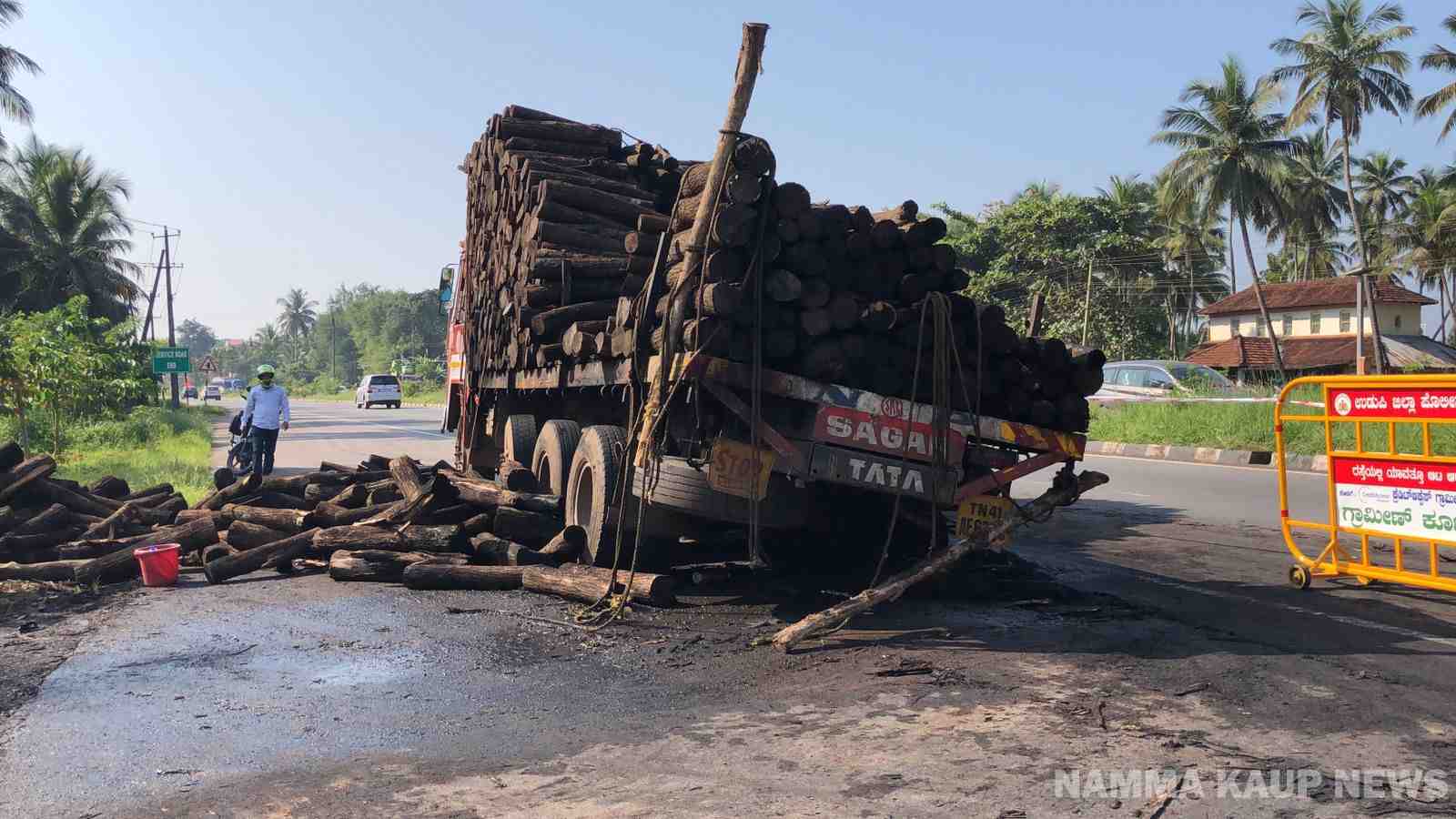 ಕಾಪು : ಮರದ ದಿಮ್ಮಿಯಿದ್ದ ಲಾರಿಯ ಟೈಯರ್ ಸ್ಫೋಟ ; ಉರಿದ ದಿಮ್ಮಿ ; ತಪ್ಪಿದ ಭಾರೀ ಅನಾಹುತ