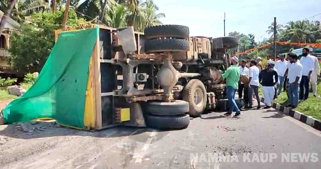 ಪಡುಬಿದ್ರಿ: ಚಾಲಕನ ನಿಯಂತ್ರಣ ತಪ್ಪಿ ಹೆದ್ದಾರಿಯಲ್ಲಿ ಪಲ್ಟಿಯಾದ ಟಿಪ್ಪರ್