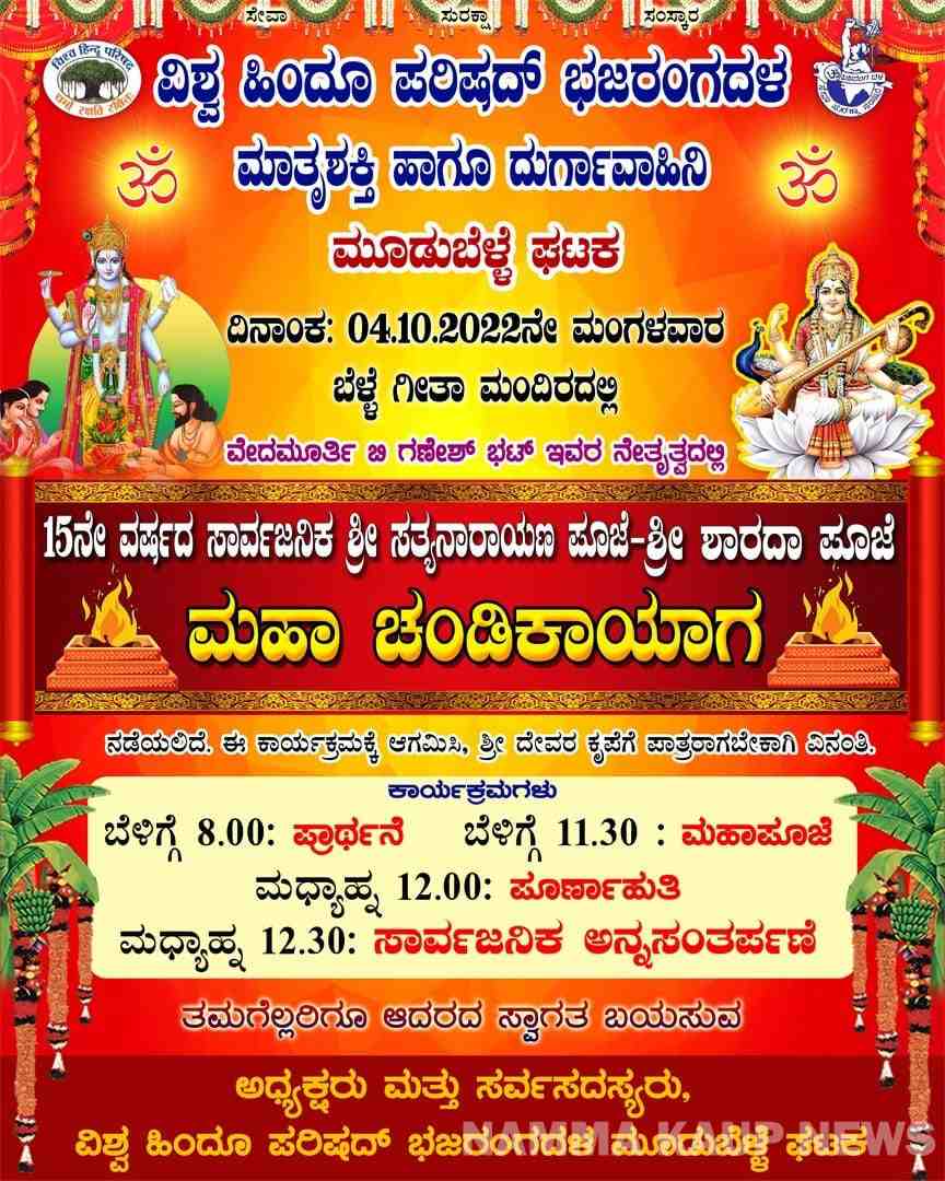 ವಿಶ್ವ ಹಿಂದೂ ಪರಿಷದ್ ಭಜರಂಗದಳ ಮಾತೃಶಕ್ತಿ ಹಾಗೂ ದುರ್ಗಾವಾಹಿನಿ ಮೂಡುಬೆಳ್ಳೆ ಘಟಕ : ಶ್ರೀ ಸತ್ಯನಾರಾಯಣ ಪೂಜೆ-ಶ್ರೀ ಶಾರದಾ ಪೂಜೆ, ಮಹಾ ಚಂಡಿಕಾಯಾಗ