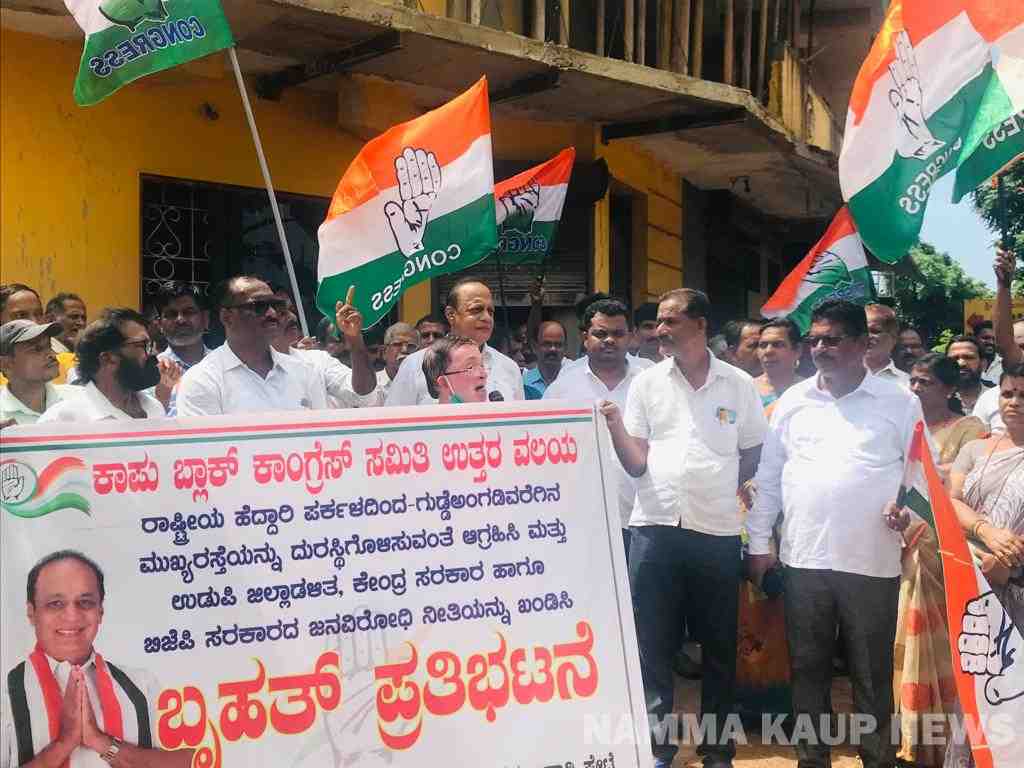 ಕಾಪು : ಇಲ್ಲಿನ ಬ್ಲಾಕ್ ಕಾಂಗ್ರೆಸ್ ಸಮಿತಿ ಉತ್ತರ ವಲಯ ಇವರ ವತಿಯಿಂದ ರಾಷ್ಟ್ರೀಯ ಹೆದ್ದಾರಿ ಪರ್ಕಳದಿಂದ- ಗುಡ್ಡೆಯಂಗಡಿ ವರೆಗಿನ ಮುಖ್ಯ ರಸ್ತೆಯನ್ನು ದುರಸ್ಥಿಗೊಳಿಸುವಂತೆ ಆಗ್ರಹಿಸಿ ಮತ್ತು ಉಡುಪಿ ಜಿಲ್ಲಾಡಳಿತ ಮತ್ತು ಕೇಂದ್ರ ಸರಕಾರ ಹಾಗೂ ಬಿಜೆಪಿ ಸರಕಾರದ ಜನವಿರೋಧಿ ನೀತಿಯನ್ನು ಖಂಡಿಸಿ ಮಾಜಿ ಸಚಿವರಾದ ವಿನಯ್ ಕುಮಾರ್ ಸೊರಕೆ ನೇತೃತ್ವದಲ್ಲಿ ಆತ್ರಾಡಿ ಪೇಟೆಯಲ್ಲಿ ಗುರುವಾರದಂದು ಬ್ರಹತ್ ಪ್ರತಿಭಟನೆಯನ್ನು ಹಮ್ಮಿ ಕೊಳ್ಳಲಾಗಿತ್ತು.