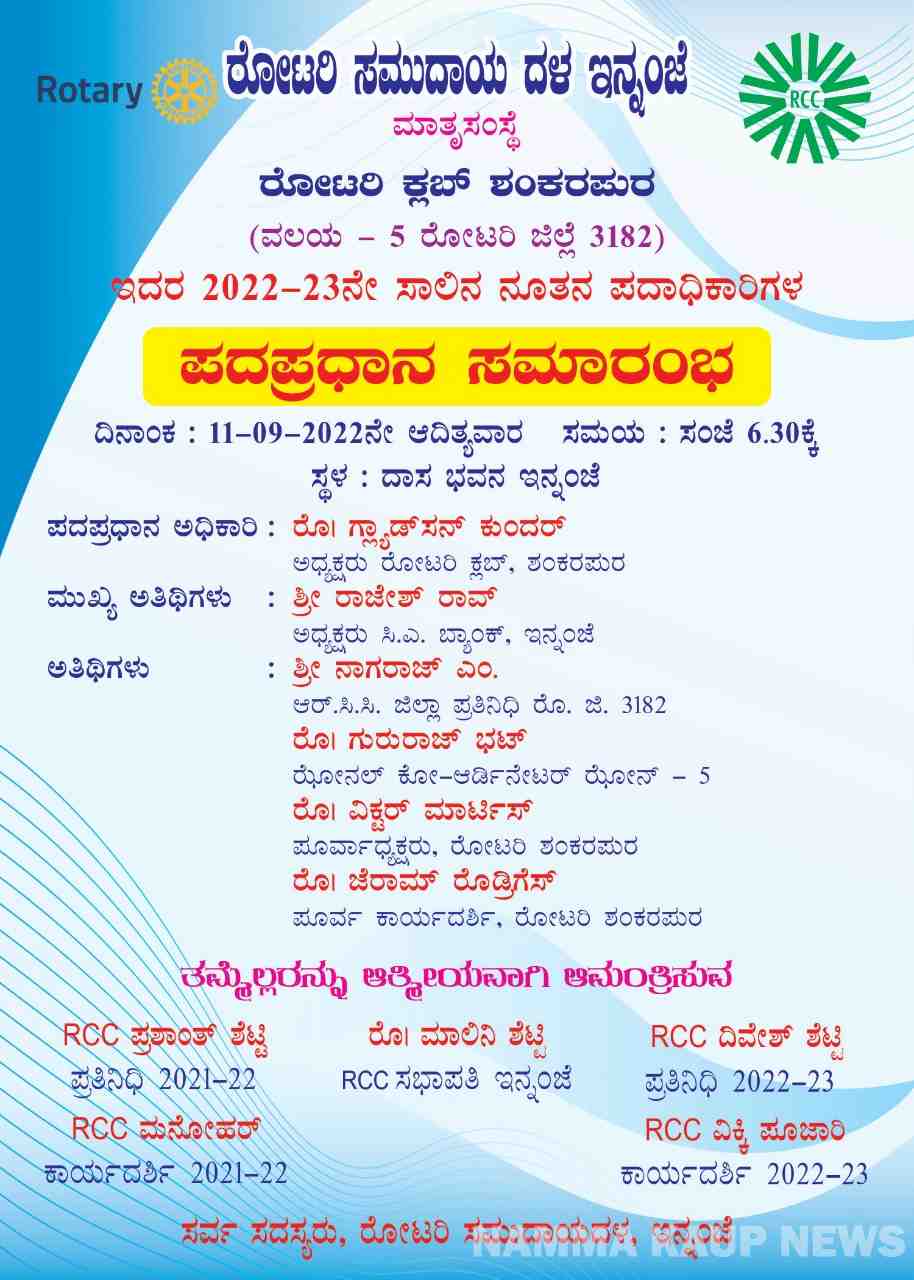 ಇನ್ನಂಜೆ : ರೋಟರಿ ಸಮುದಾಯ ದಳ ಇನ್ನಂಜೆ ಮಾತೃಸಂಸ್ಥೆ ರೋಟರಿ ಕ್ಲಬ್ ಶಂಕರಪುರ (ವಲಯ - 5 ರೋಟರಿ ಜಿಲ್ಲೆ 3182) ಇದರ 2022-23ನೇ ಸಾಲಿನ ನೂತನ ಪದಾಧಿಕಾರಿಗಳ ಪದಪ್ರಧಾನ ಸಮಾರಂಭ ಸೆಪ್ಟೆಂಬರ್ 11, ಆದಿತ್ಯವಾರ ಸಂಜೆ 6.30ಕ್ಕೆ ಇನ್ನಂಜೆಯ ದಾಸ ಭವನದಲ್ಲಿ ಜರಗಲಿದೆ.