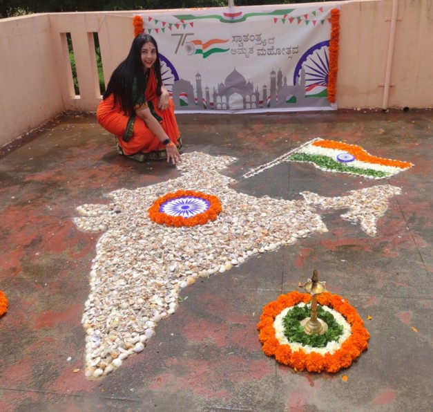 ಉಡುಪಿ : ಇಲ್ಲಿಯ ಅಪರ ಜಿಲ್ಲಾಧಿಕಾರಿ ವೀಣಾ ಬಿ.ಎನ್ ಅವರು ತಮ್ಮ ಮನೆಯಲ್ಲಿ ಕಪ್ಪೆಚಿಪ್ಪುಗಳ ಮೂಲಕ ಭಾರತ ಭೂಪಟವನ್ನು ರಚಿಸಿ, ತ್ರಿವರ್ಣ ಧ್ವಜ ಹಾರಿಸಿದ್ದಾರೆ.
