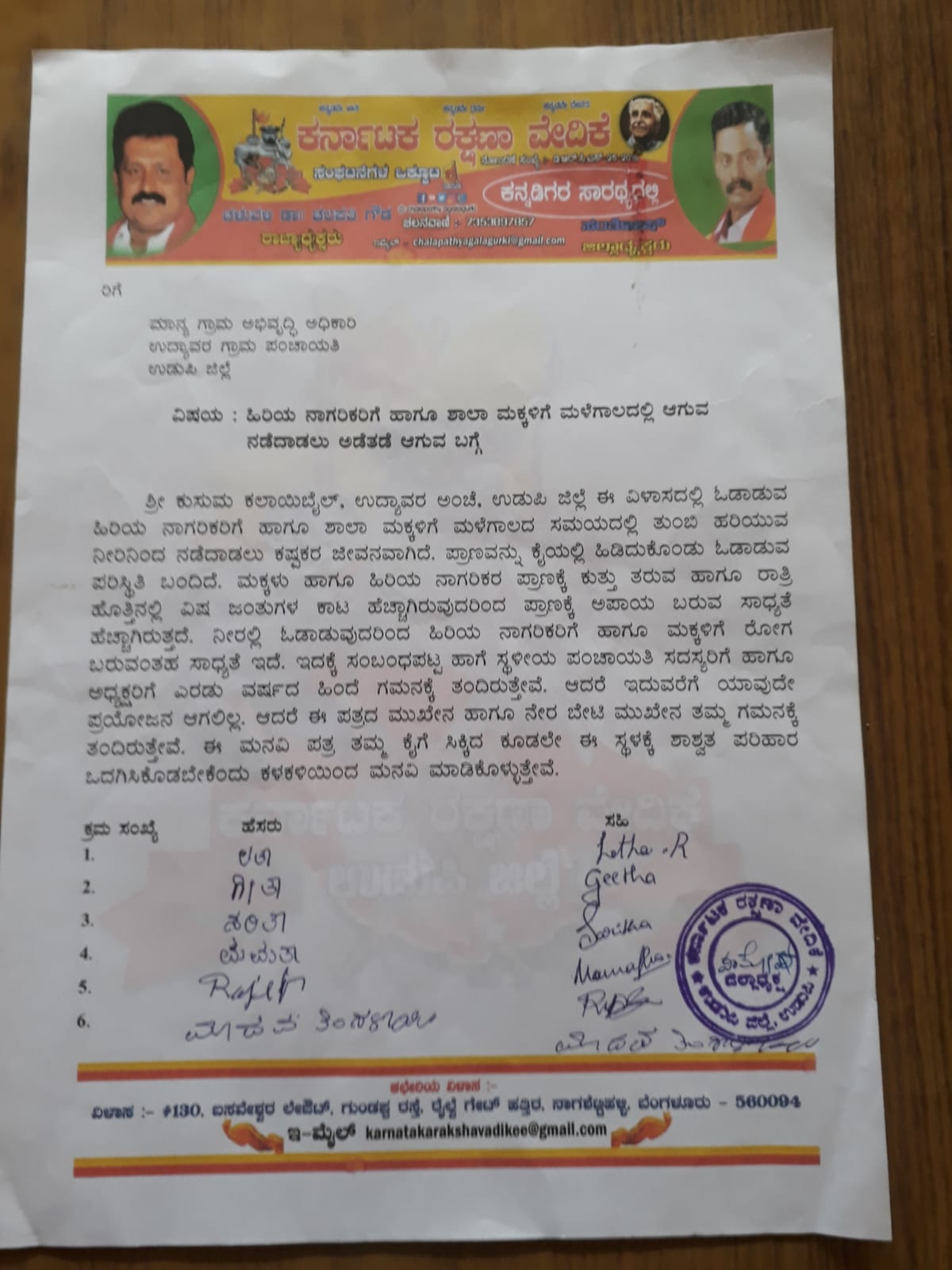 ಉದ್ಯಾವರ : ಮಳೆಗಾಲದ ಸಮಸ್ಯೆ - ಕರ್ನಾಟಕ ರಕ್ಷಣಾ ವೇದಿಕೆ ಉಡುಪಿ ಜಿಲ್ಲಾ ಘಟಕದಿಂದ ಪಂಚಾಯತ್ಗೆ ಮನವಿ