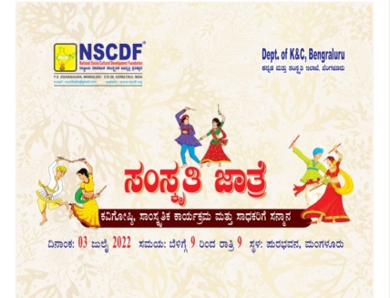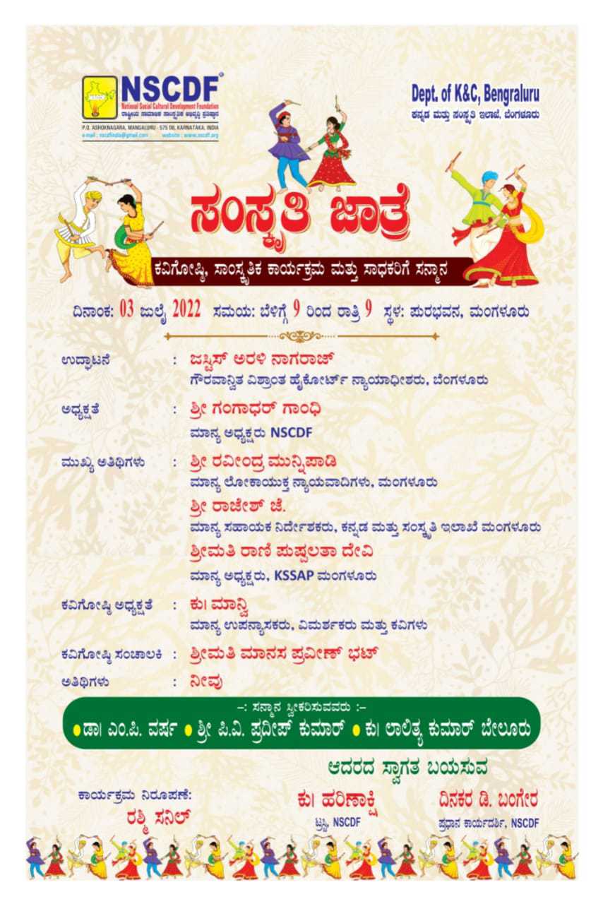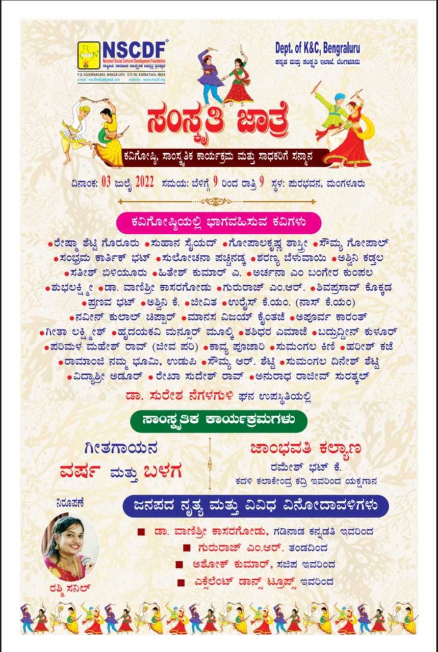 ಜುಲೈ 3 : ಎನ್ ಎಸ್ ಸಿ ಡಿ ಎಫ್ ಆಶ್ರಯದಲ್ಲಿ ಸಂಸ್ಕೃತಿ ಜಾತ್ರೆ - ಕವಿಗೋಷ್ಠಿ, ಸಾಂಸ್ಕೃತಿಕ ಕಾರ್ಯಕ್ರಮ, ಸಾಧಕರಿಗೆ ಸನ್ಮಾನ
