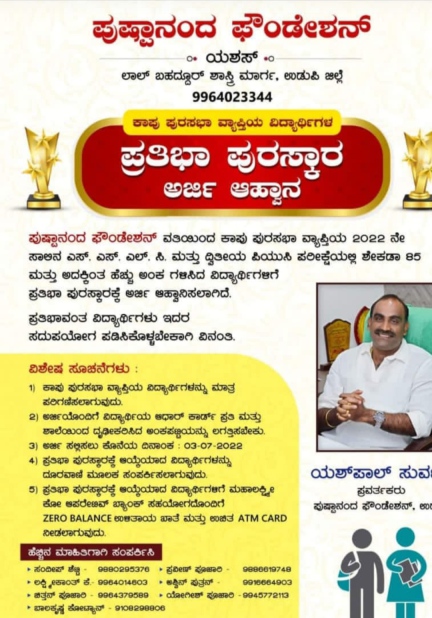 ಪುಷ್ಪಾನಂದ ಫೌಂಡೇಶನ್ ವತಿಯಿಂದ ಕಾಪು ಪುರಸಭಾ ವ್ಯಾಪ್ತಿಯ ವಿದ್ಯಾರ್ಥಿಗಳಿಗಾಗಿ ಪ್ರತಿಭಾ ಪುರಸ್ಕಾರಕ್ಕೆ ಅರ್ಜಿ ಆಹ್ವಾನ
