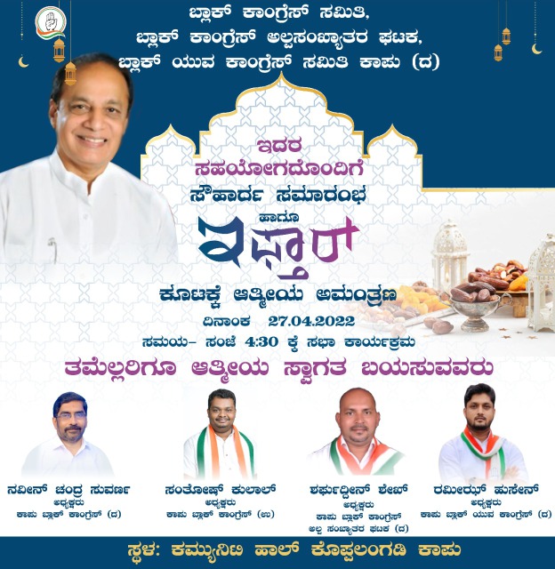 ಕಾಪು : ಬ್ಲಾಕ್ ಕಾಂಗ್ರೆಸ್ ಸಮಿತಿ, ಬ್ಲಾಕ್ ಕಾಂಗ್ರೆಸ್ ಅಲ್ಪಸಂಖ್ಯಾತರ ಘಟಕ, ಬ್ಲಾಕ್ ಯುವ ಕಾಂಗ್ರೆಸ್ ಸಮಿತಿ ಕಾಪು (ದ) ಇದರ ಸಹಯೋಗದೊಂದಿಗೆ ಸೌಹಾರ್ದ ಸಮಾರಂಭ ಹಾಗೂ ಇಫ್ತಾರ್ ಕೂಟವು ಏಪ್ರಿಲ್ 27ರ ಸಂಜೆ 4:30 ಕ್ಕೆ ಕಾಪುವಿನ ಕೊಪ್ಪಲಂಗಡಿಯ ಕಮ್ಯುನಿಟಿ ಹಾಲ್ ನಲ್ಲಿ ಸಭಾ ಕಾರ್ಯಕ್ರಮದೊಂದಿಗೆ ಜರಗಲಿದೆ ಎಂದು ಪ್ರಕಟಣೆಯಲ್ಲಿ ತಿಳಿಸಿದ್ದಾರೆ.