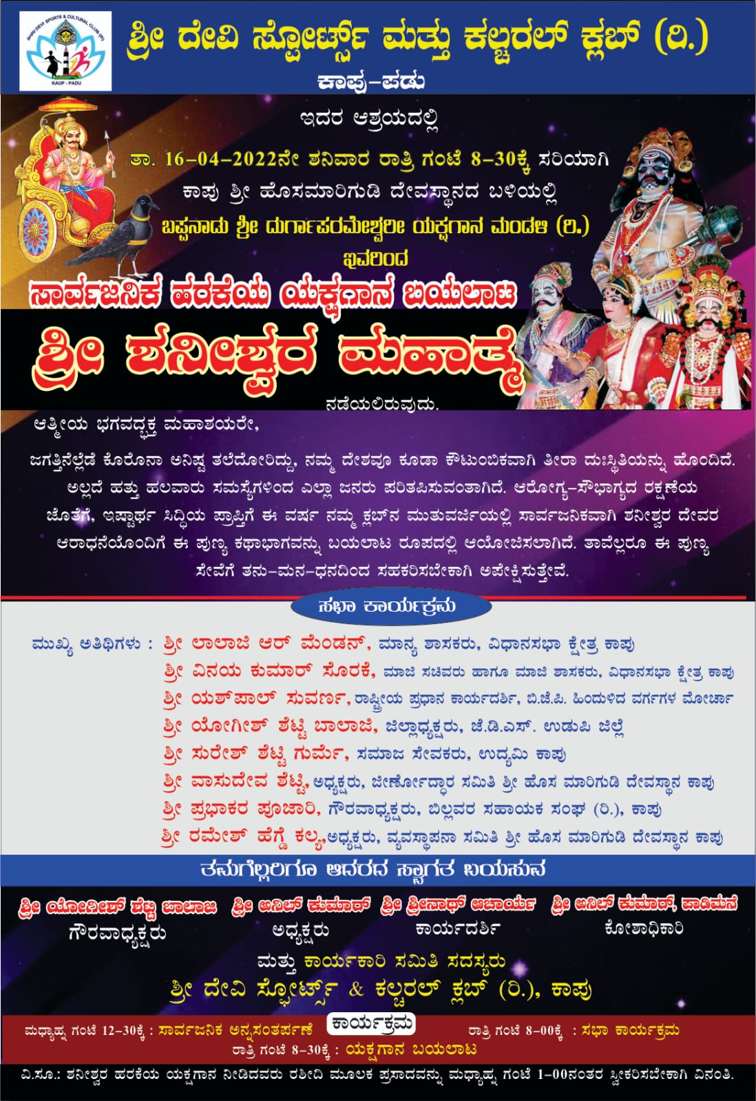 ಕಾಪು : ಕಾಪು -ಪಡು ಇಲ್ಲಿನ ಶ್ರೀ ದೇವಿ ಸ್ಪೋರ್ಟ್ಸ್ ಮತ್ತು ಕಲ್ಚರಲ್ ಕ್ಲಬ್ ಇದರ ಆಶ್ರಯದಲ್ಲಿ ಏಪ್ರಿಲ್ 16, ಶನಿವಾರ ಮಧ್ಯಾಹ್ನ 12: 30ಕ್ಕೆ ಸಾರ್ವಜನಿಕ ಅನ್ನಸಂತರ್ಪಣೆ, ರಾತ್ರಿ 8 ಗಂಟೆಗೆ ಶ್ರೀ ಹೊಸ ಮಾರಿಗುಡಿ ದೇವಸ್ಥಾನದ ಆವರಣದಲ್ಲಿ ಸಭಾ ಕಾರ್ಯಕ್ರಮ ಮತ್ತು ಬಪ್ಪನಾಡು ಶ್ರೀ ದುರ್ಗಾಪರಮೇಶ್ವರಿ ದೇವಸ್ಥಾನದ ಯಕ್ಷಗಾನ ಮಂಡಳಿ ಇವರಿಂದ ಸಾರ್ವಜನಿಕ ಹರಕೆಯ ಯಕ್ಷಗಾನ ಬಯಲಾಟ ಶ್ರೀ ಶನೀಶ್ವರ ಮಹಾತ್ಮೆ ಜರಗಲಿದೆ. ಈ ಪ್ರಯುಕ್ತ ಮಾಚ್೯ 20 ರಂದು ಕಾರ್ಯಕ್ರಮದ ಪೋಸ್ಟರ್ ಬಿಡುಗಡೆಗೊಳಿಸಲಾಯಿತು.