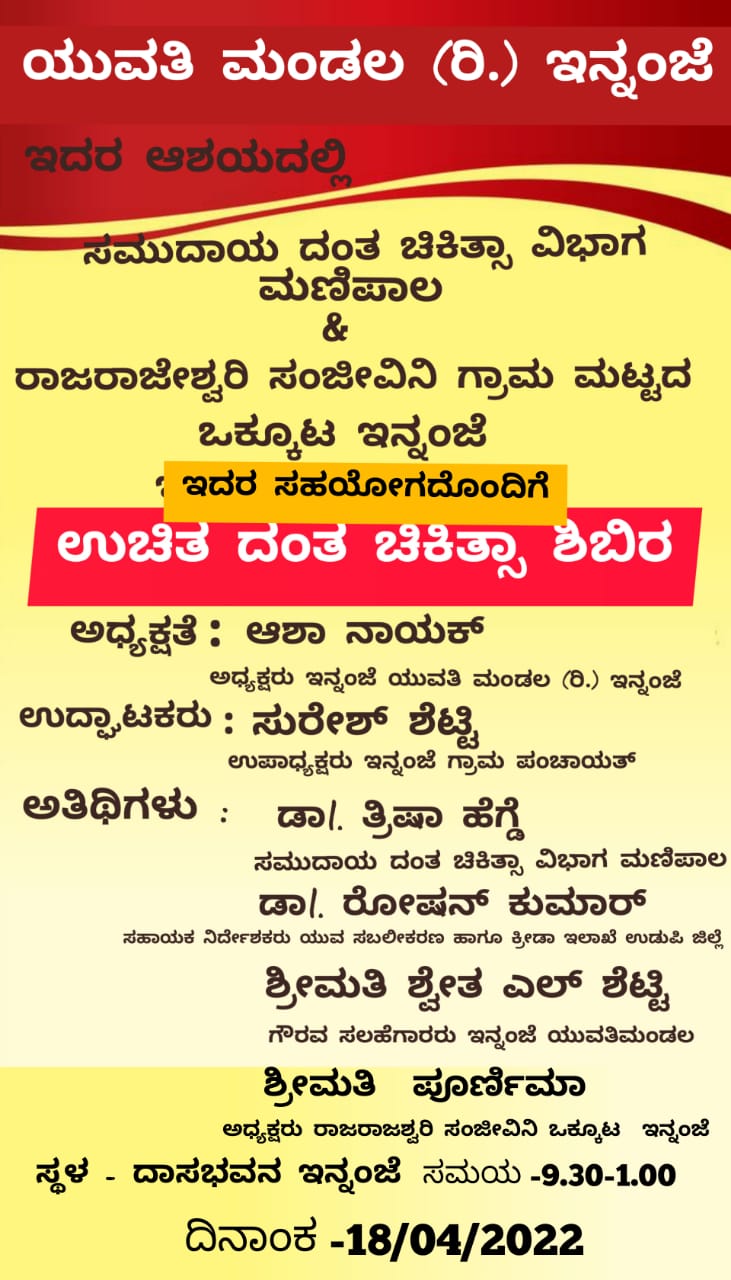 ಕಾಪು : ಯುವತಿ ಮಂಡಲ (ರಿ.) ಇನ್ನಂಜೆ ಇದರ ಆಶ್ರಯದಲ್ಲಿ ಸಮುದಾಯ ದಂತ ಚಿಕಿತ್ಸಾ ವಿಭಾಗ ಮಣಿಪಾಲ ಮತ್ತು ರಾಜರಾಜೇಶ್ವರಿ ಸಂಜೀವಿನಿ ಗ್ರಾಮ ಮಟ್ಟದ ಒಕ್ಕೂಟ ಇನ್ನಂಜೆ ಇದರ ಸಹಯೋಗದೊಂದಿಗೆ ಉಚಿತ ದಂತ ಚಿಕಿತ್ಸಾ ಶಿಬಿರ ಏಪ್ರಿಲ್ 18, ಸೋಮವಾರ ಇನ್ನಂಜೆ ದಾಸಭವನದಲ್ಲಿ ಬೆಳಿಗ್ಗೆ 9.30 ರಿಂದ ಮಧ್ಯಾಹ್ನ 1ಗಂಟೆವರೆಗೆ ಜರಗಲಿದೆ.