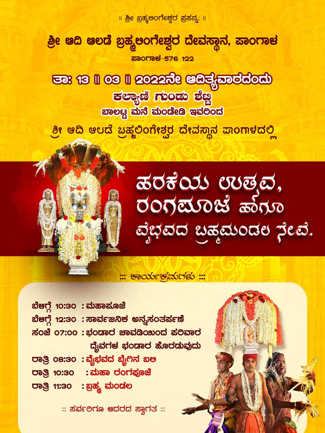 ಮಾಚ್೯ 13 : ಪಾಂಗಾಳ ಬ್ರಹ್ಮಲಿಂಗೇಶ್ವರ ಆದಿ ಆಲಡೆಯಲ್ಲಿ ಹರಕೆಯ ಉತ್ಸವ, ರಂಗಪೂಜೆ, ಬ್ರಹ್ಮಮಂಡಲ ಸೇವೆ