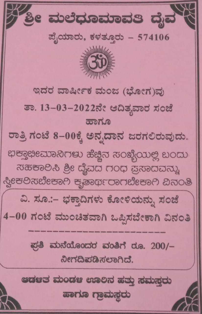 ಕಾಪು : ಕಳತ್ತೂರು ಪೈಯಾರು ಶ್ರೀ ಮಲೆಧೂಮಾವತಿ ದೈವ ಸನ್ನಿಧಿಯಲ್ಲಿ ವಾರ್ಷಿಕ ಮಂಜ (ಭೋಗ) ಹಾಗೂ ರಾತ್ರಿ ಅನ್ನದಾನ ಕಾರ್ಯಕ್ರಮ ಮಾರ್ಚ್ 13 ರಂದು ನಡೆಯಲಿದೆ.