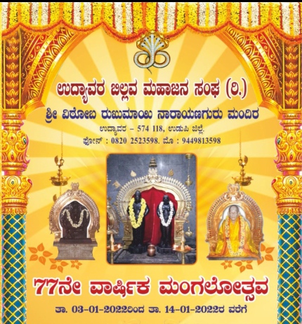 ಉದ್ಯಾವರ : ಇಲ್ಲಿನ ಬಿಲ್ಲವ ಮಹಾಜನ ಸಂಘ (ರಿ.) ಇದರ ಶ್ರೀ ವಿಠೋಬ ರುಖುಮಾಯಿ ನಾರಾಯಣಗುರು ಮಂದಿರದಲ್ಲಿ 77ನೇ ವಾರ್ಷಿಕ ಮಂಗಲೋತ್ಸವವು ಜರಗಲಿದೆ.