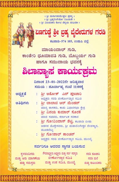 ಕಟಪಾಡಿ : ಏಣಗುಡ್ಡೆ ಶ್ರೀ ಬ್ರಹ್ಮ ಬೈದೇರುಗಳ ಗರಡಿ ಇಲ್ಲಿಯ ಮಾಯಂದಾಲ್ ಗುಡಿ, ಕಾಂತೇರಿ ಧೂಮಾವತಿ ಗುಡಿ, ಬೊಬ್ಬರ್ಯ ಗುಡಿ ಹಾಗೂ ಸಮುದಾಯ ಭವನಕ್ಕೆ ಶಿಲಾನ್ಯಾಸ ಕಾರ್ಯಕ್ರಮ ಜನವರಿ 23, ಆದಿತ್ಯವಾರ ಪೂರ್ವಾಹ್ನ ಗಂಟೆ 11ಗಂಟೆಗೆ ಜರಗಲಿದೆ.
