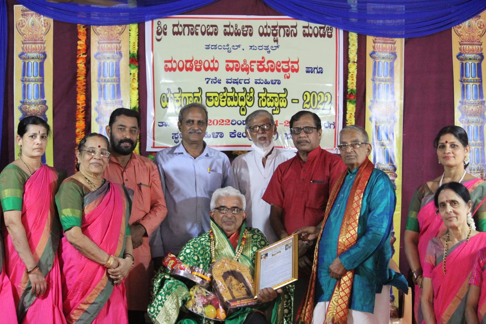 ಸುರತ್ಕಲ್ : ತಡಂಬೈಲು ಶ್ರೀದುರ್ಗಾಂಬಾ ಮಹಿಳಾ ಯಕ್ಷಗಾನ ಮಂಡಳಿಯ ಏಳನೇ ವರ್ಷದ ತಾಳಮದ್ದಳೆ ಸಪ್ತಾಹದ ಸಮರೋಪ ಸಮಾರಂಭದಲ್ಲಿ ಪಾರ್ತಿಸುಬ್ಬ ಪ್ರಶಸ್ತಿ ಪುರಸ್ಕೃತ , ಹಿರಿಯ ಯಕ್ಷಗಾನ ವಿದ್ವಾಂಸ,ಪ್ರಸಂಗಕರ್ತ,ಸಾಹಿತಿ ಶ್ರೀಧರ ಡಿ.ಎಸ್.ಅವರನ್ನು ಅಭಿನಂದಿಸಿ ಸಮ್ಮಾನಿಸಲಾಯಿತು.