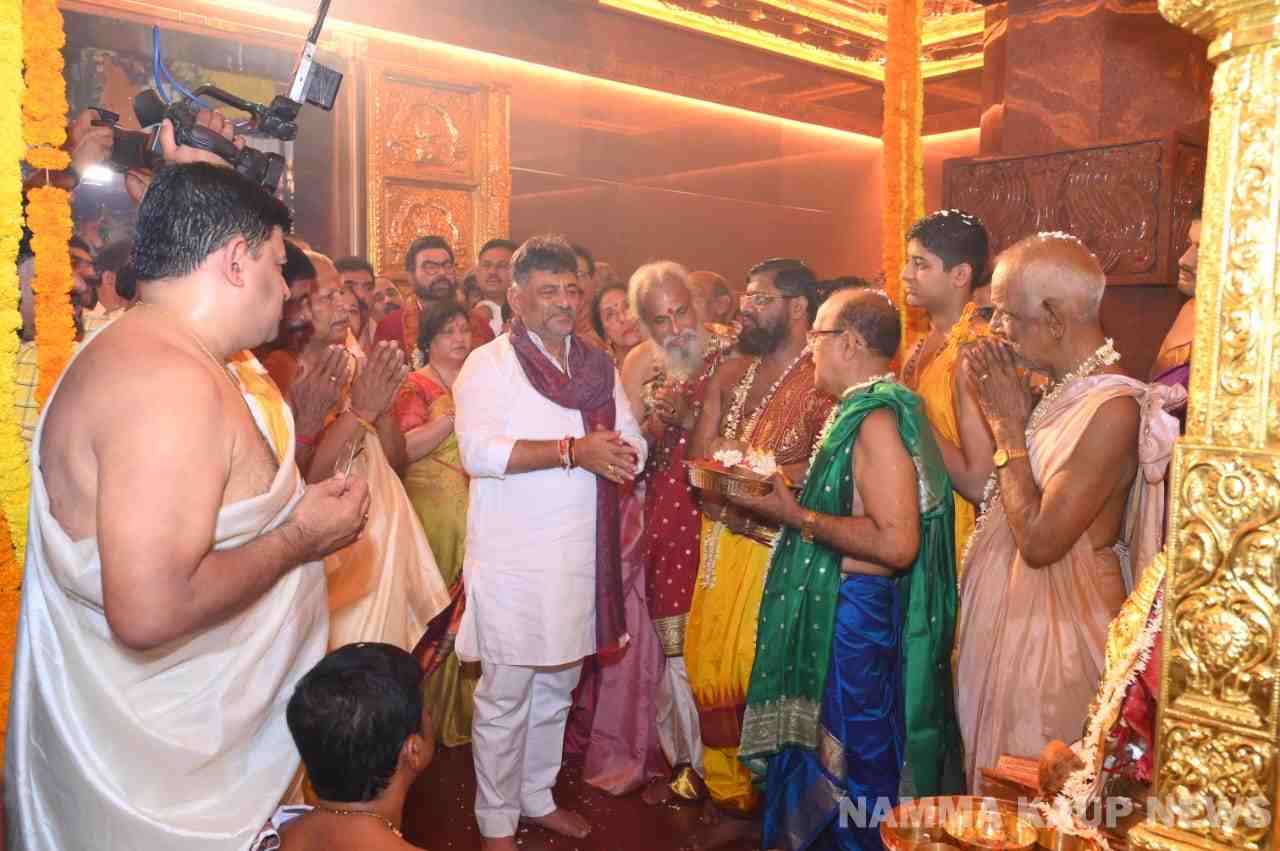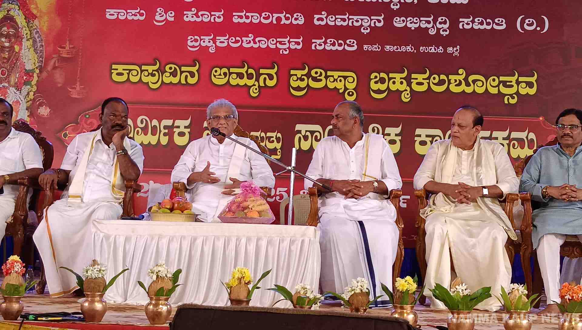 ಕಾಪು : ಕಾಪು ಮಾರಿಯಮ್ಮ ದೇವರ ಗದ್ದುಗೆ ಪ್ರತಿಷ್ಠಾನೆಯ ಮೊದಲ ಪ್ರಸಾದ ಸಿಕ್ಕಿದ್ದು ನನ್ನ ಭಾಗ್ಯ. ಸರಕಾರದ ಹಣವಿಲ್ಲದೆ ಭಕ್ತರು ಸ್ವ ಇಚ್ಛೆಯಿಂದ ನೀಡಿದ ಹಣದಲ್ಲಿ ಇಷ್ಟು ದೊಡ್ಡ ದೇವಳ ಕಟ್ಟಿದ್ದು ಅದ್ಭುತ. ಕಷ್ಟ ದೂರ ಮಾಡಿ, ರಕ್ಷಿಸುವ ಸನ್ನಿಧಾನ ಕಾಪು. ಇಲ್ಲಿ ಜಾತಿ ಇಲ್ಲ. ಎಲ್ಲರೂ ಮಾನವ ಜಾತಿ. ಧರ್ಮ ಎದ್ದು ಕಾಣುತ್ತಿದೆ. ಧರ್ಮದಿಂದಲೇ ವಿಶ್ವಕ್ಕೆ ಶಾಂತಿ. ಎಲ್ಲರಿಗೂ ಒಳಿತಾಗಲಿ ಎಂದು ಕರ್ನಾಟಕ ಸರಕಾರದ ಉಪ ಮುಖ್ಯಮಂತ್ರಿ ಡಿ.ಕೆ.ಶಿವಕುಮಾರ್ ಹೇಳಿದರು. ಅವರು ಆದಿತ್ಯವಾರ ಕಾಪು ಶ್ರೀ ಹೊಸಮಾರಿಗುಡಿಯಲ್ಲಿ ಶ್ರೀ ಮಾರಿಯಮ್ಮ ದೇವರ ಮಹಾಸ್ವರ್ಣಪೀಠದೊಂದಿಗೆ (ಗದ್ದಿಗೆ) ವ್ಯಸ್ತಾಂಗಸಮಸ್ತನ್ಯಾಸಪೂರ್ವಕ ಶ್ರೀ ಮಾರಿಯಮ್ಮನ ಪ್ರತಿಷ್ಠೆ, ಶ್ರೀ ಉಚ್ಚಂಗಿದೇವಿಯ ಸ್ವರ್ಣ ಪೀಠದೊಂದಿಗೆ ವ್ಯಸ್ತಾಂಗಸಮಸ್ತನ್ಯಾಸಪೂರ್ವಕ ಶ್ರೀ ಉಚ್ಚಂಗಿದೇವಿಯ ಪ್ರತಿಷ್ಠೆಯಲ್ಲಿ ಪಾಲ್ಗೊಂಡ ಬಳಿಕ ಜರಗಿದ ಸಭಾ ಕಾರ್ಯಕ್ರಮದಲ್ಲಿ ಮಾತನಾಡಿದರು.
